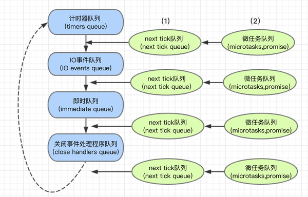 中间队列(intermediate queue):包括(1)Next Ticks队列和(2)其他微任务队列