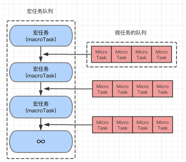 每次从宏任务队列中取一个宏任务执行, 完成后, 把微任务队列中的所有微任务,一次性处理完