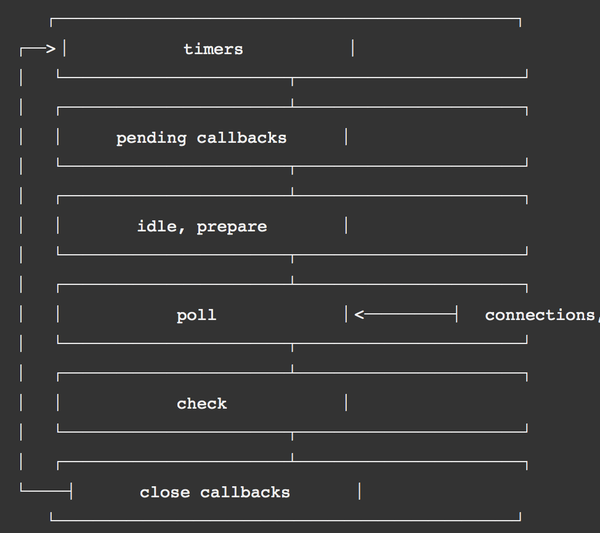 pending callbacks: 检索新的 I/O 事件;执行与 I/O 相关的回调(几乎所有情况下,除了关闭的回调函数,它们由计时器和 setImmediate() 排定的之外),其余情况 node 将在此处阻塞。