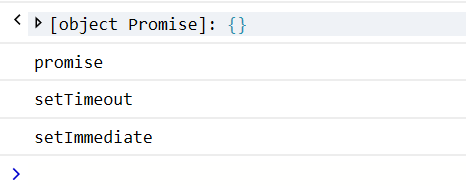 setTimeout (function () { console.log ('setTimeout'); }, 0); setImmediate (function () { console.log ('setImmediate'); }); new Promise (function (resolve, reject) { resolve (); }).then (function () { console.log ('promise'); });