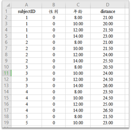 明显的,本研究数据为纵向数据即重复测量,同一对象测量了4个年龄段(还有一种纵向数据是比如同一对象测量不同的几个部位),本份数据由于没有缺失数据,因变量为定量数据,因而也可使用重复测量方差进行研究(年龄为组内项)。本案例使用GEE进行研究分析。