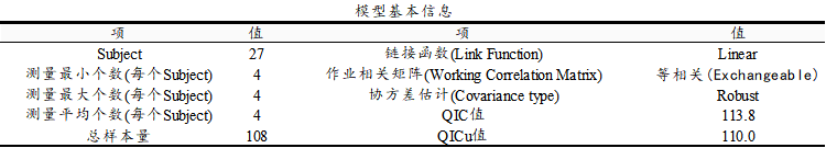 上表格展示模型基本信息,包括每个研究对象subject的测量数量,本案例全部都是4,即都测量了4次;比如本次研究对象为27个,每个对象都有完整的4次重复测量数据,因此测量最小,最大或平均个数均为4。