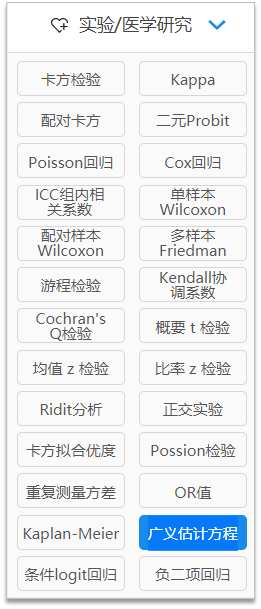 登录SPSSAU,选择【实验/医学研究】--【广义估计方程】。