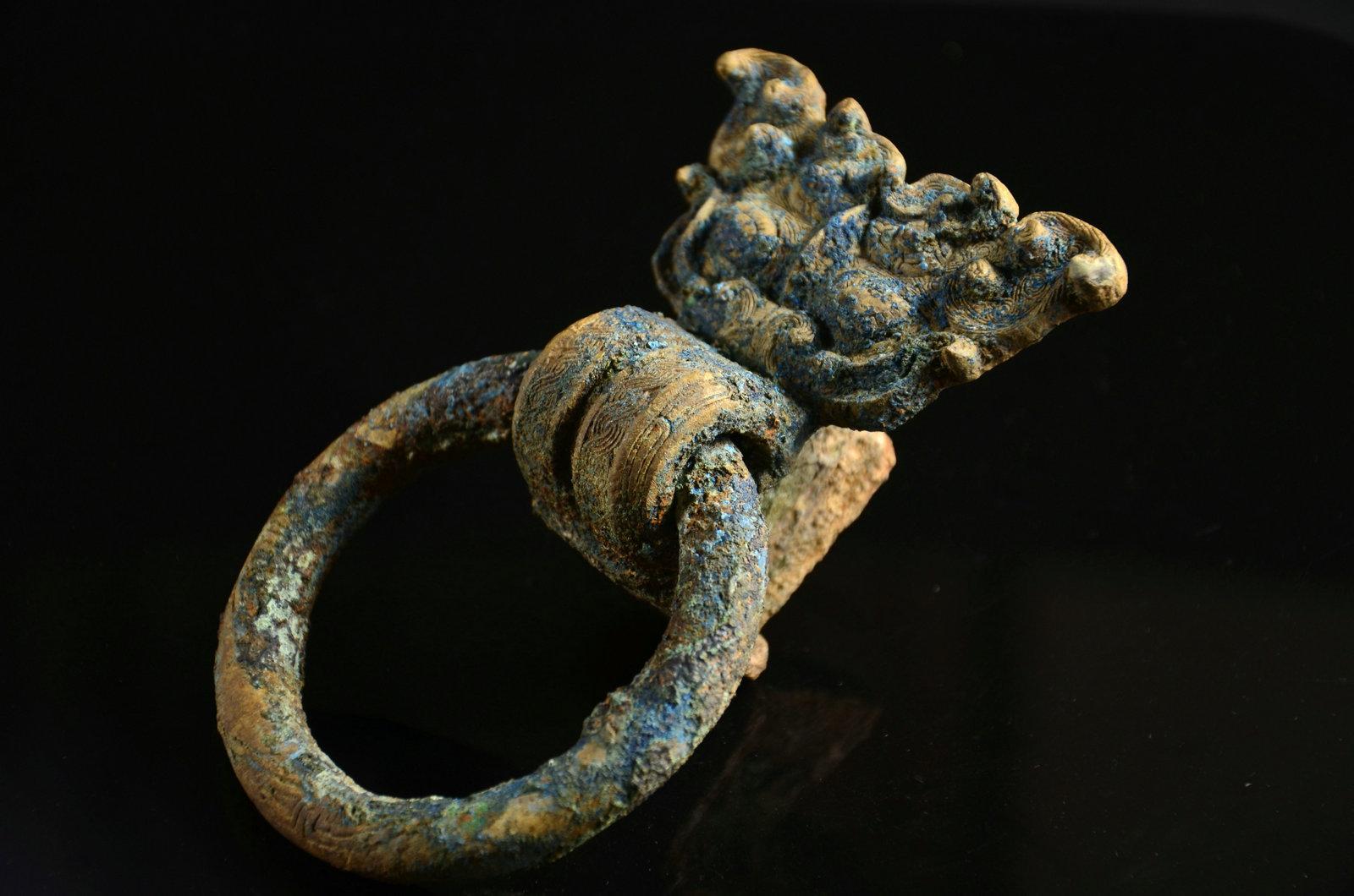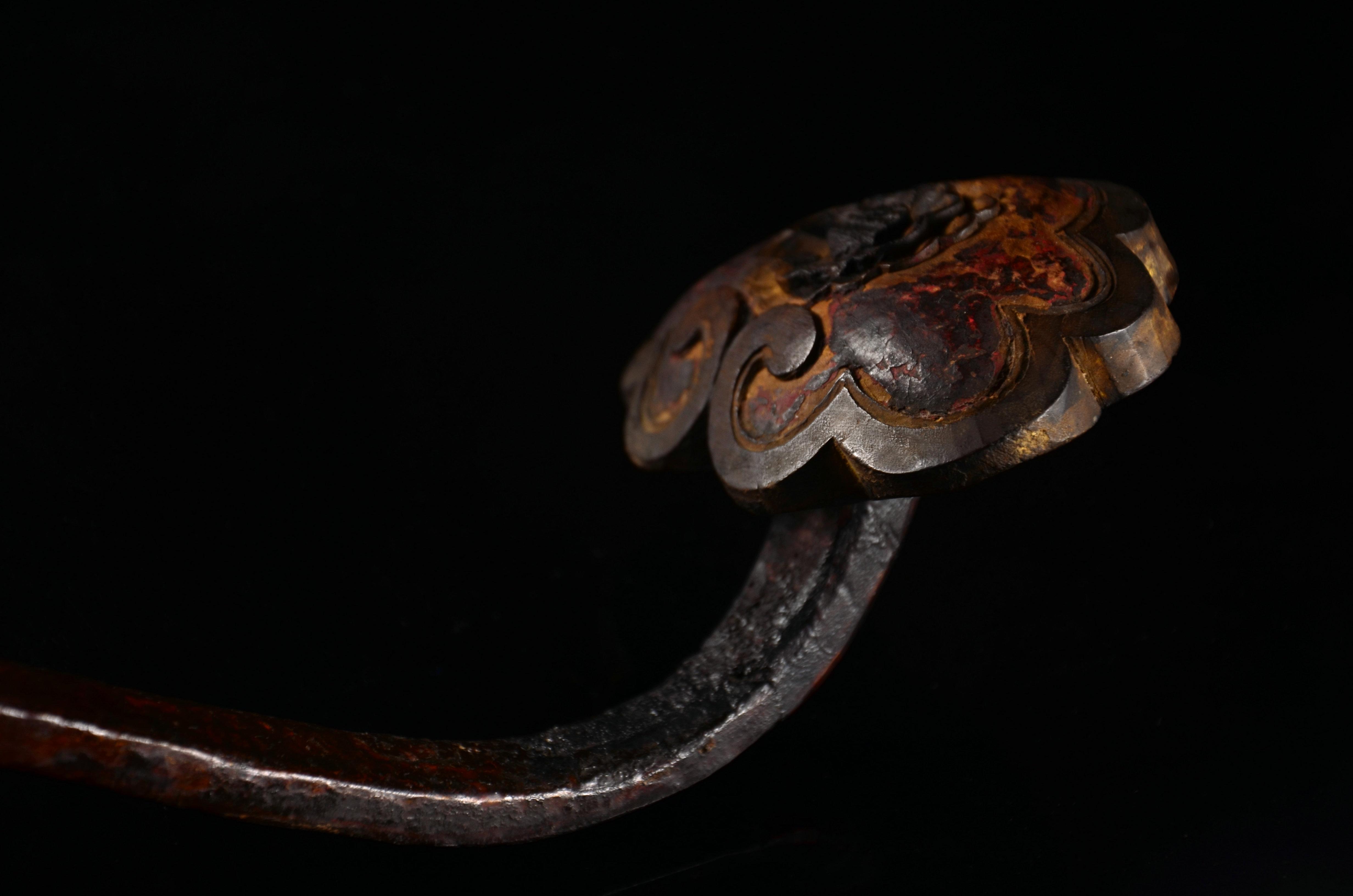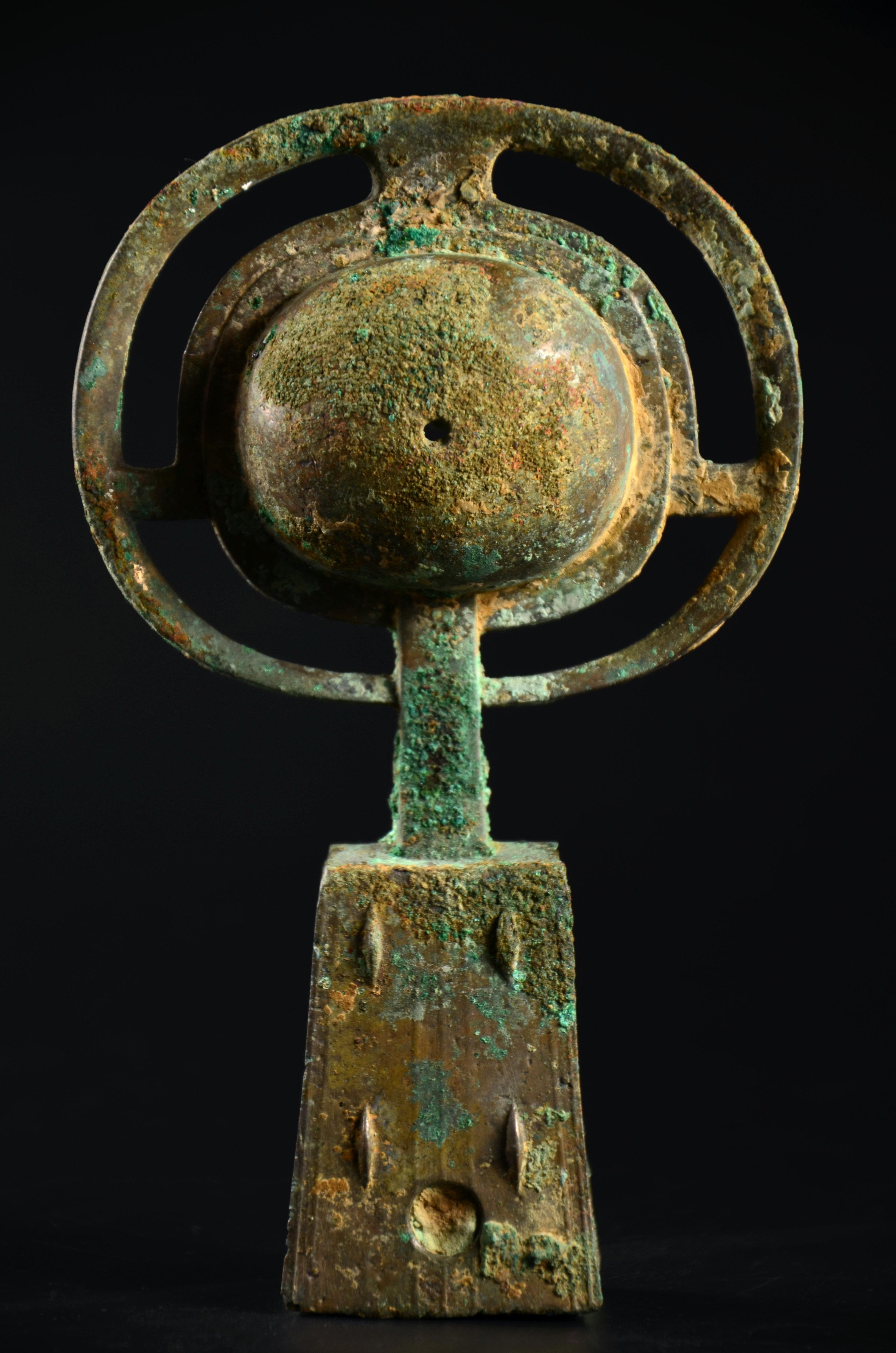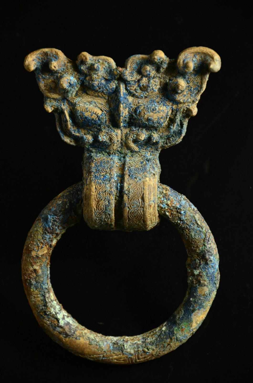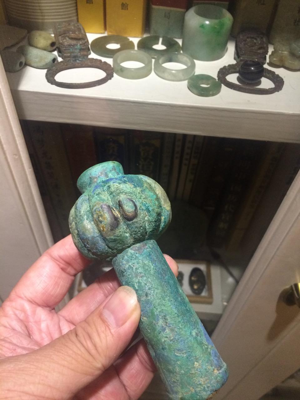 这个没太多好说的东西,就是年份早和少见。这种锤的形制,有学者认为是受欧洲罗马时代权杖的影响。迄今无定论。绿锈皮壳下,鎏金依然可见,所以不清了,就这样了吧。