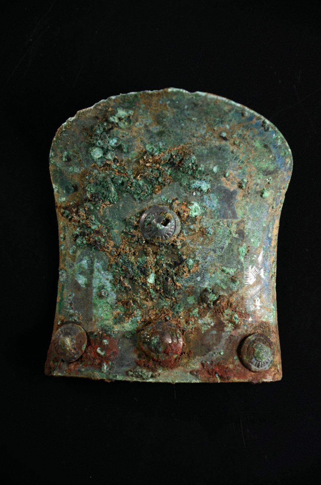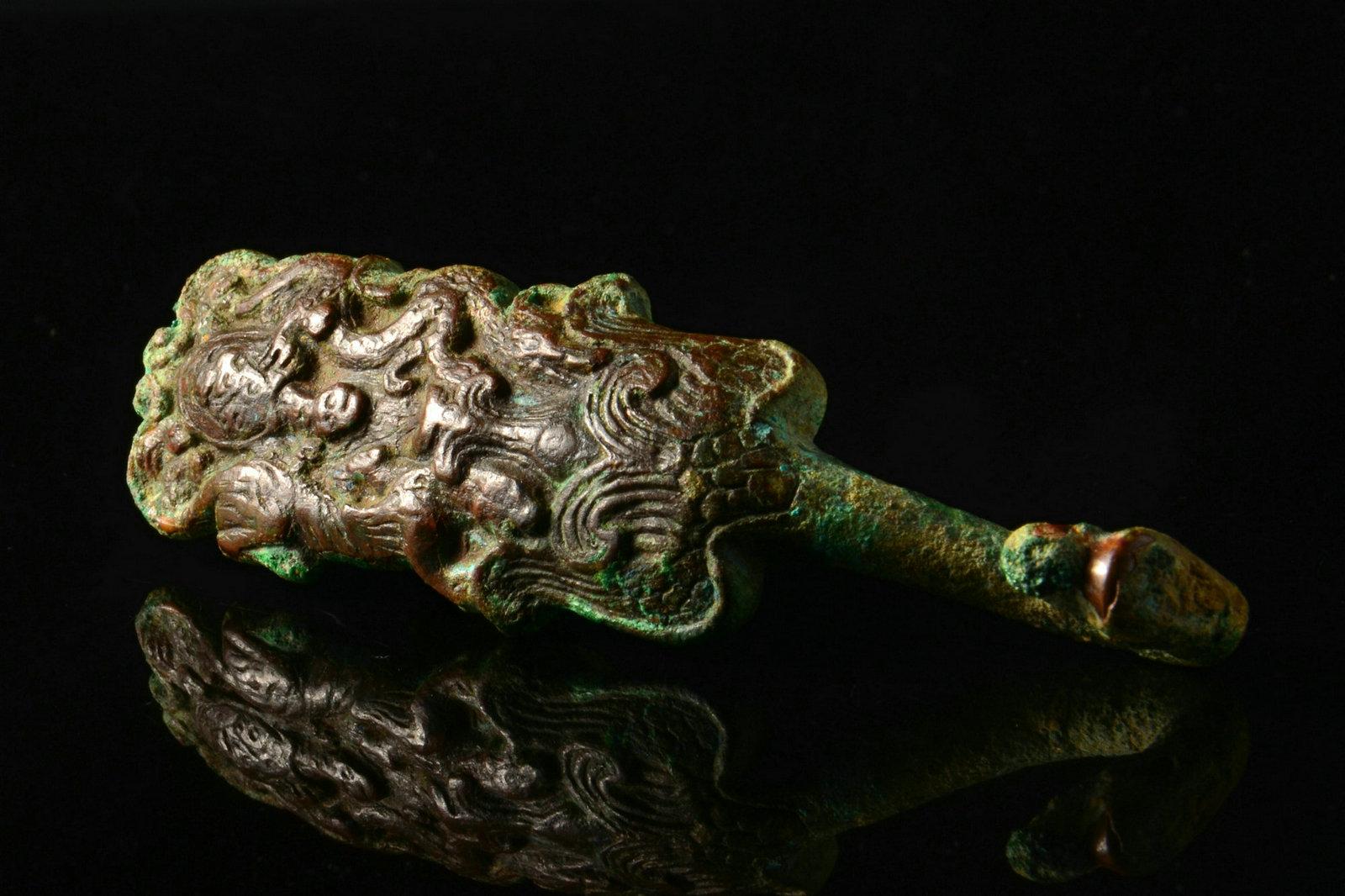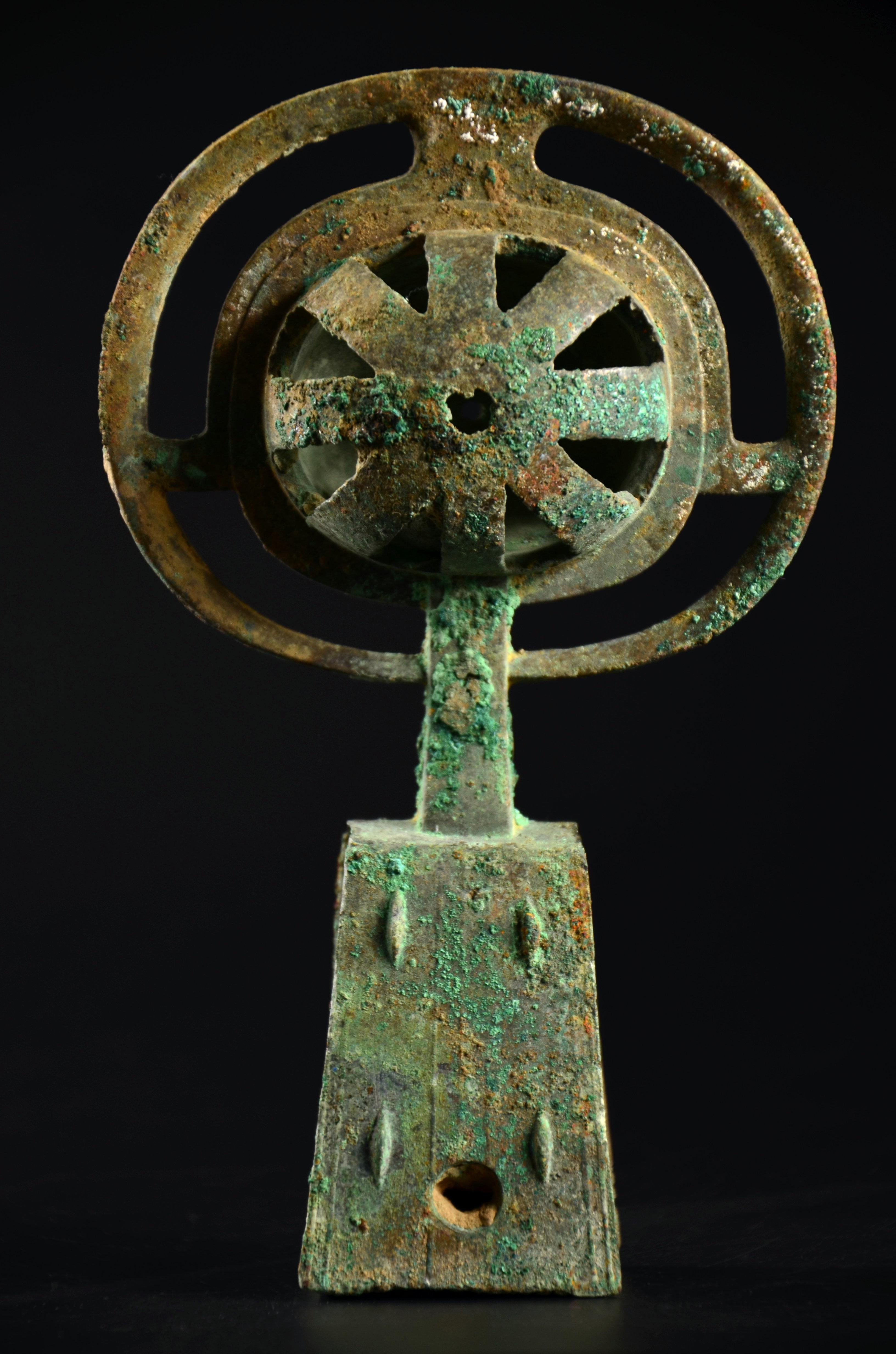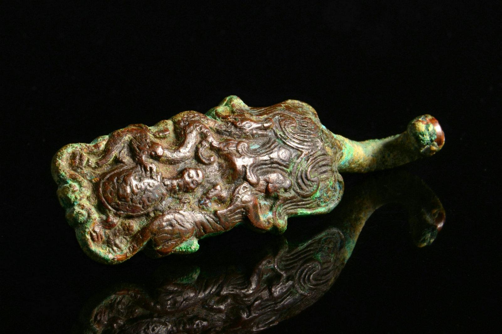 这个没太多好说的东西,就是年份早和少见。这种锤的形制,有学者认为是受欧洲罗马时代权杖的影响。迄今无定论。绿锈皮壳下,鎏金依然可见,所以不清了,就这样了吧。