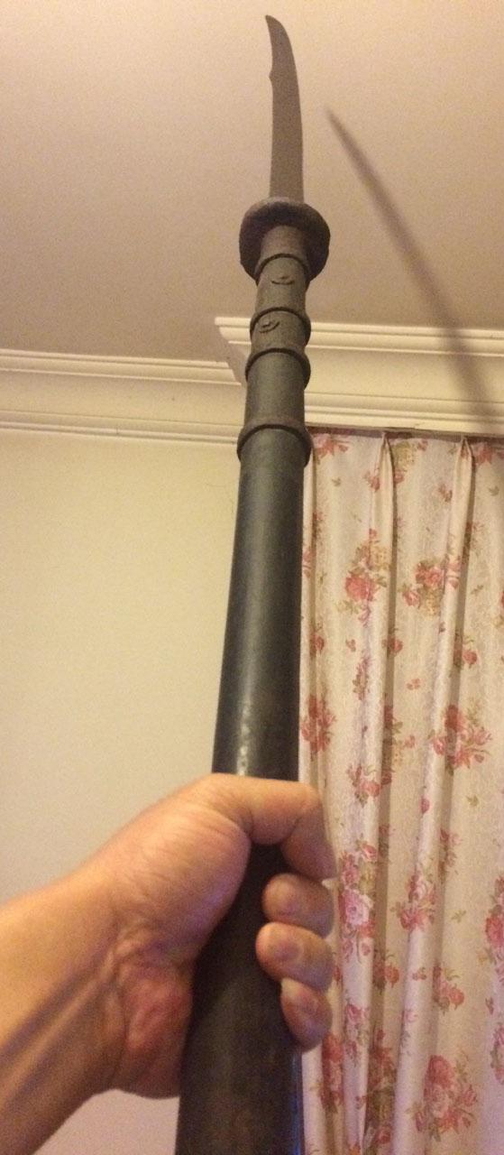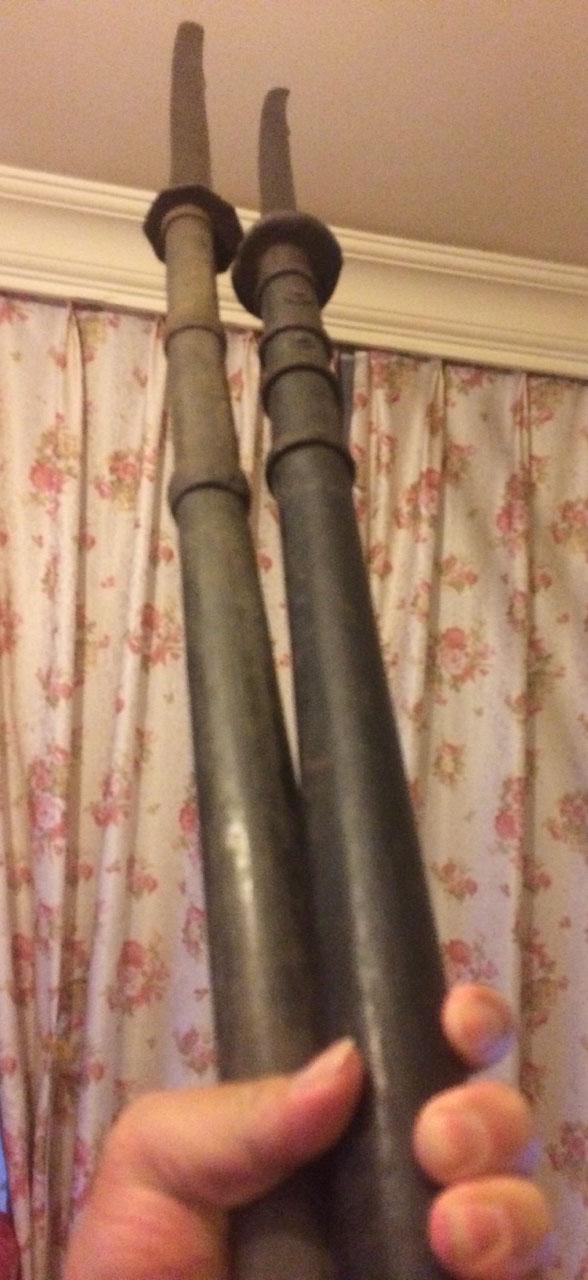 两杆长刀形制差不多,第一图下边那口八角镡的断明,年纪大点。上面那口是清。厚度都非常大,接近一厘米。原杆原卯,附件一样不少,也是难得。杆子非常粗,一手握满满的一把。东西不算很罕见,不过能凑出一对状态好,而且都完整的,还是比较有意思的。