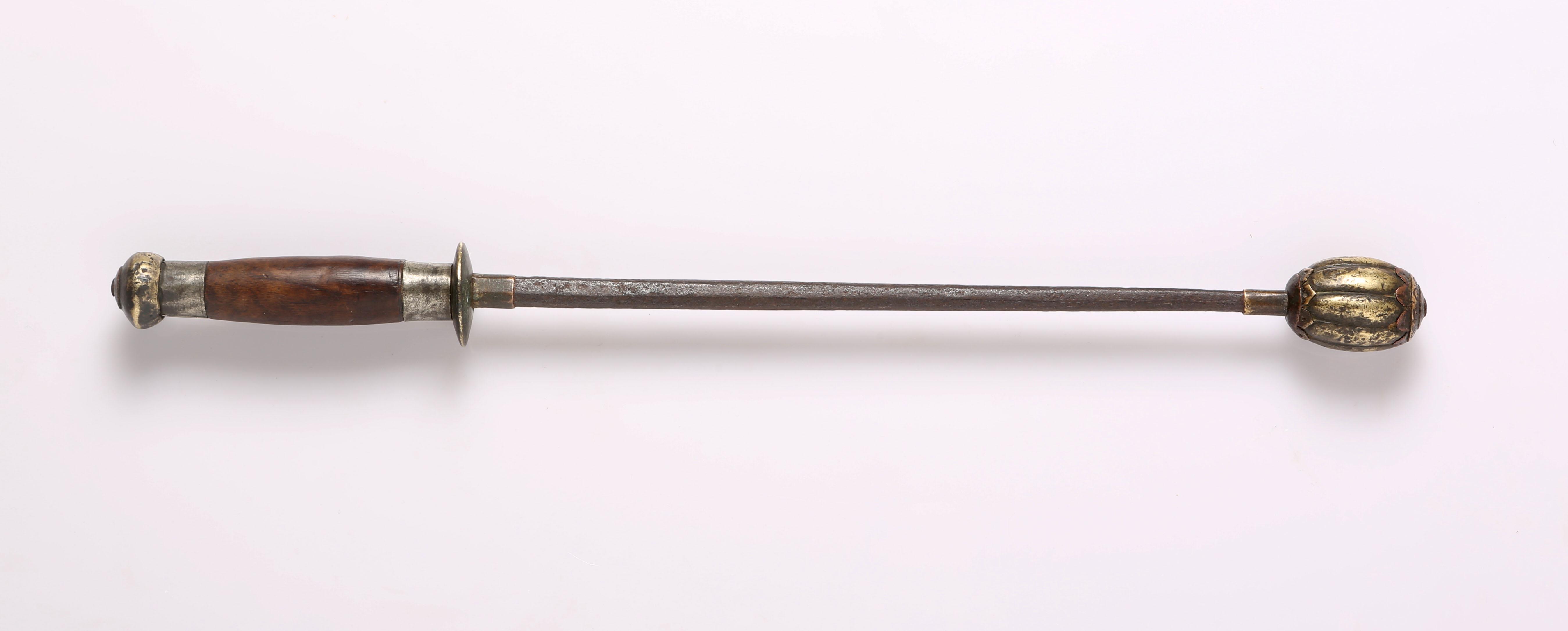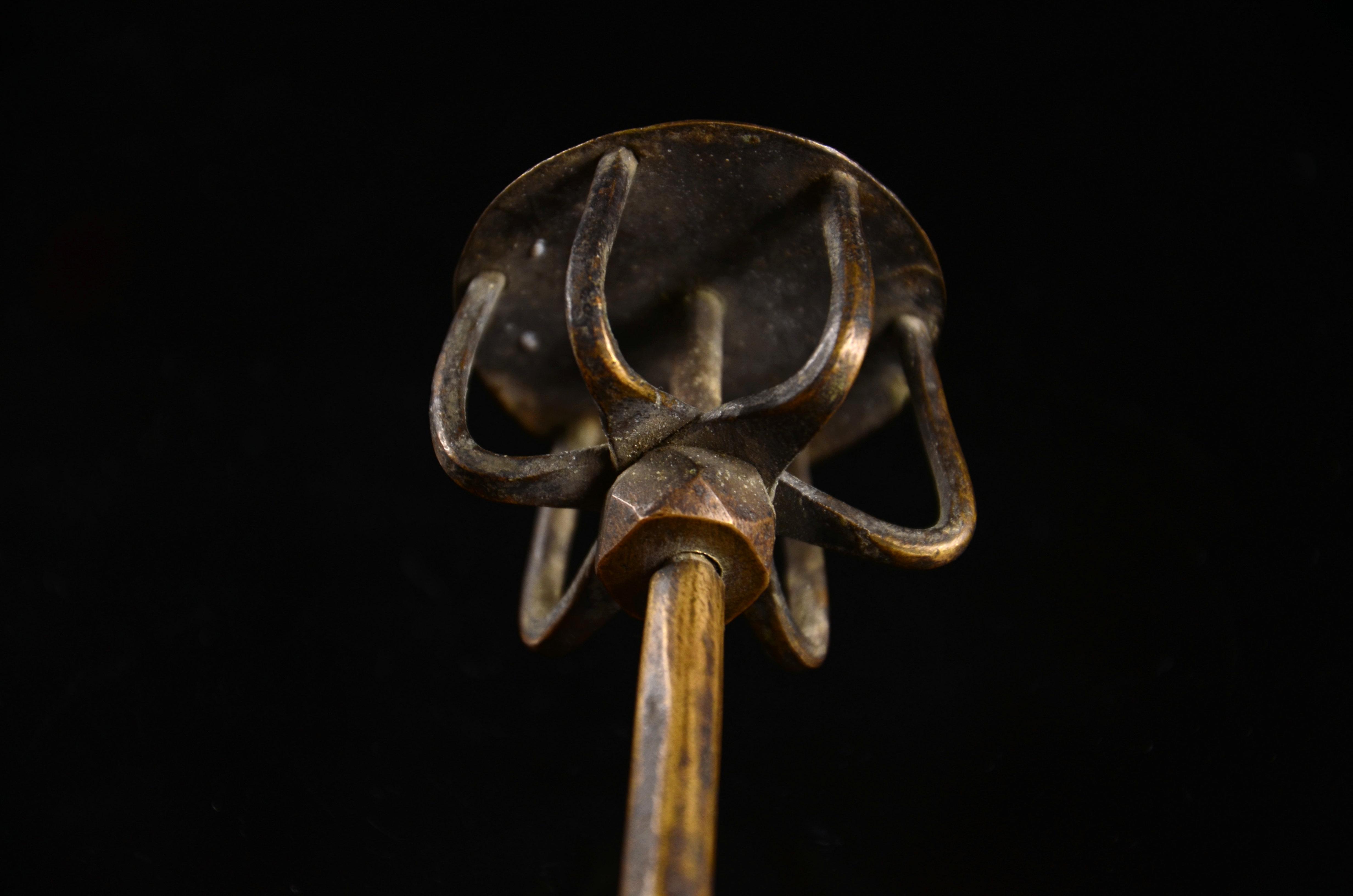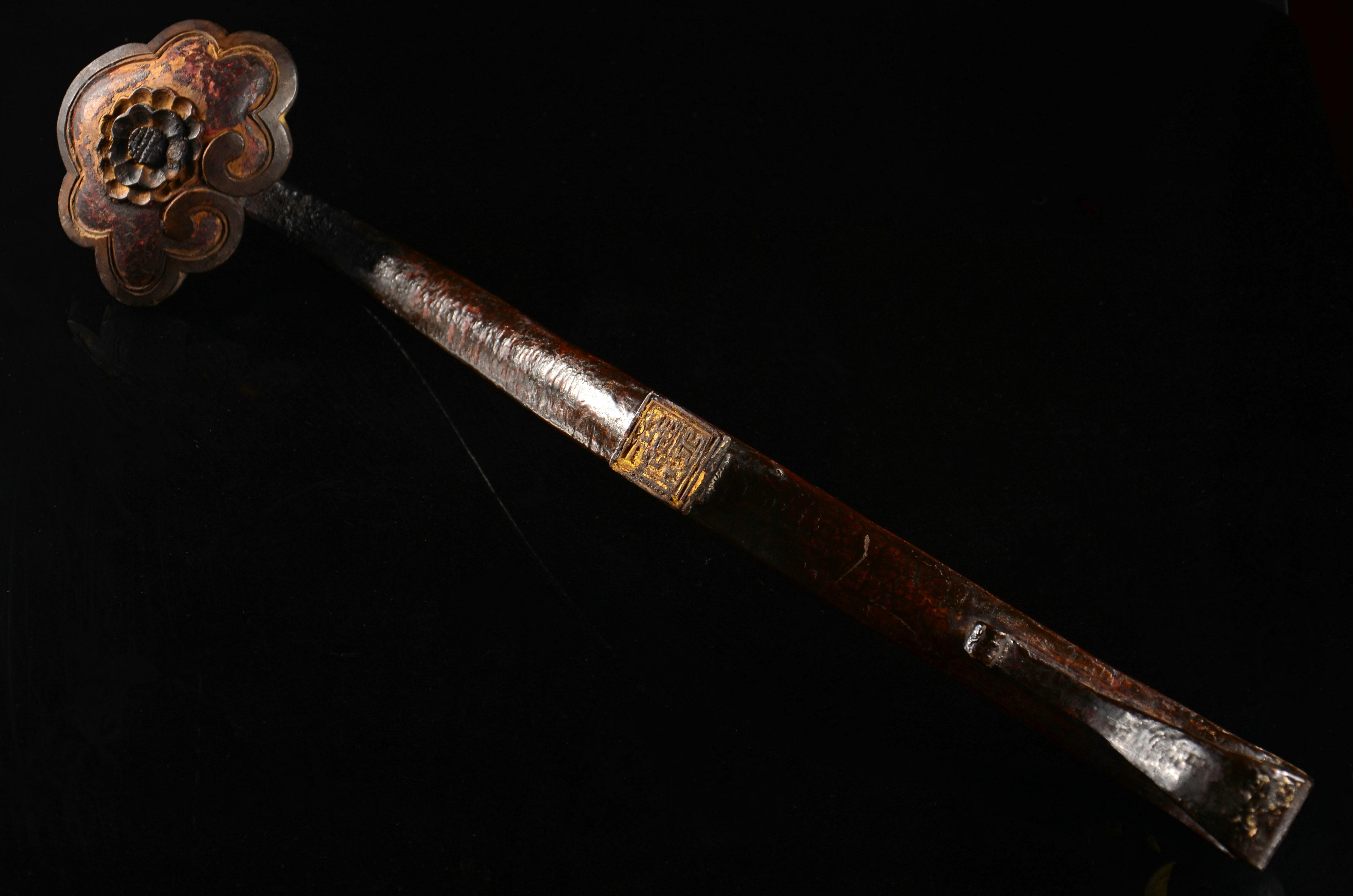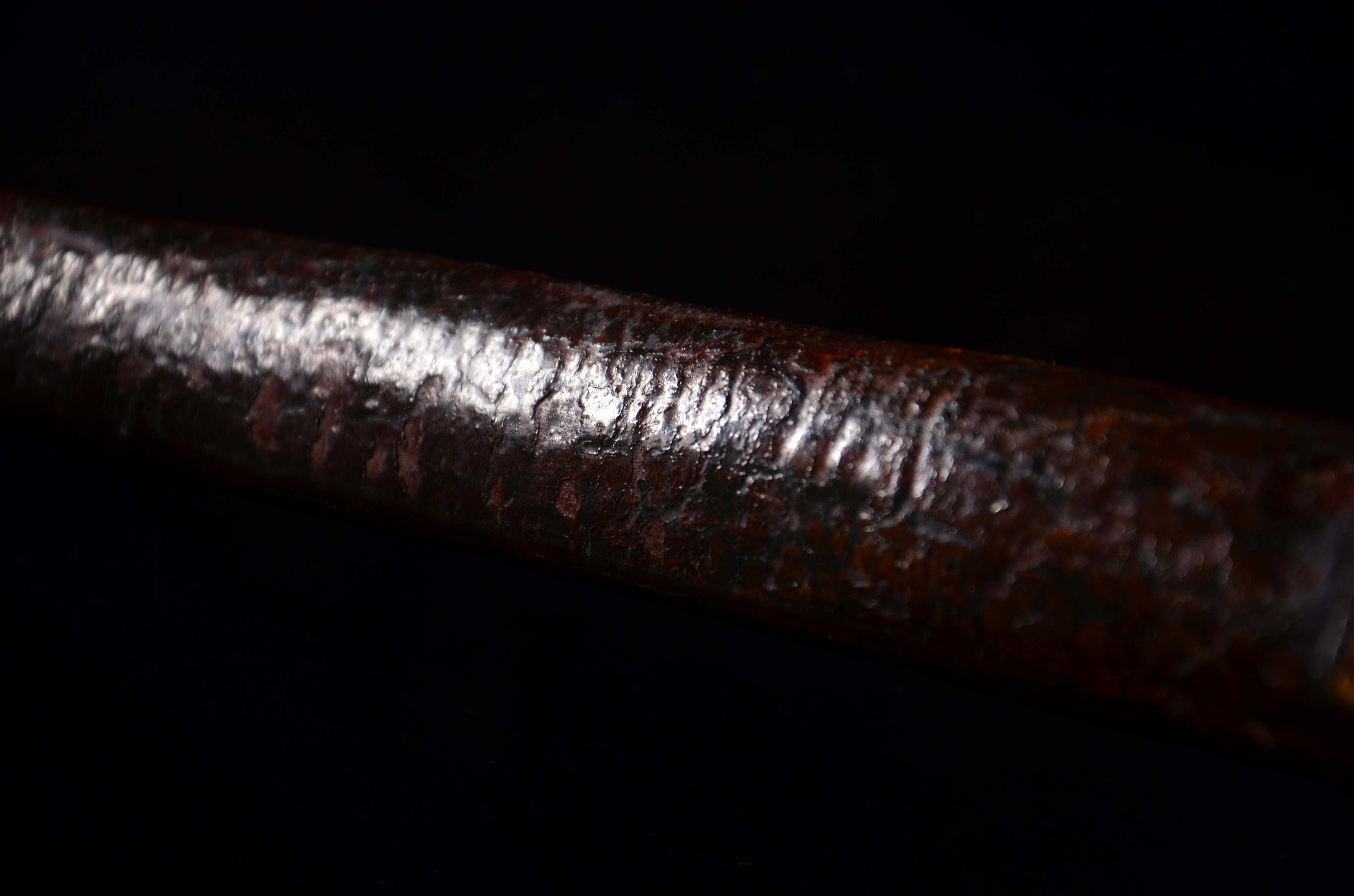 一般来说铜制的要比铁制的等级高。不过因为年代不是太一样,所以也不好说,但等级肯定不会低到哪里去。另外,从管上的绞丝箍以及凹凸弦纹等这些比较鲜明而更近宋代的特征看,这杆锤应是宋末到元时期的,至迟下限到明初。算起来最少也七百多年了。