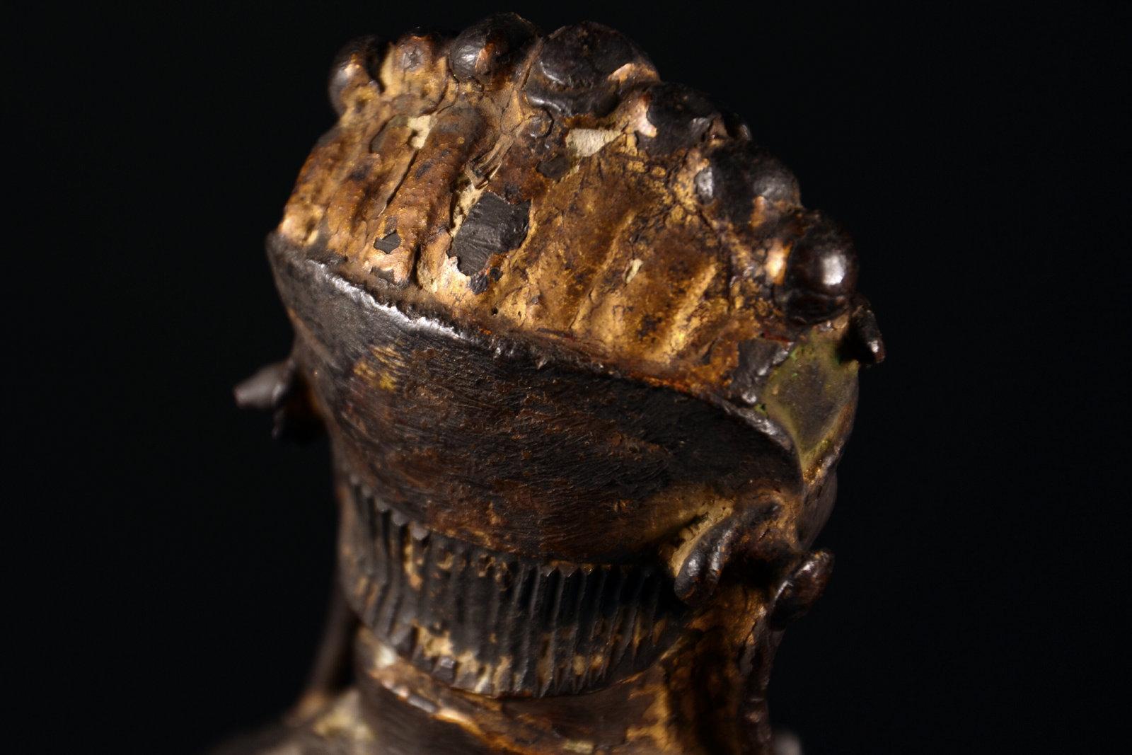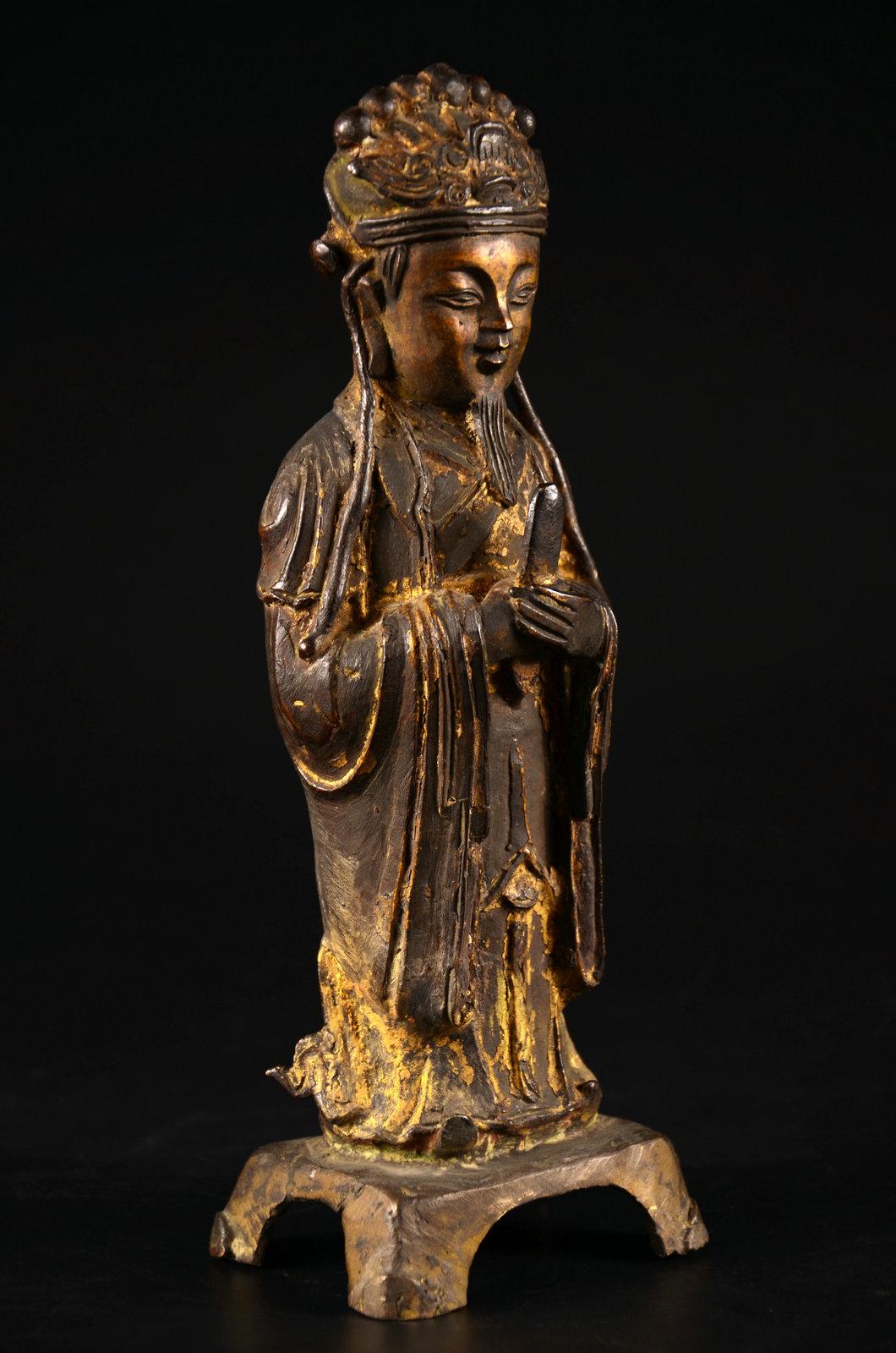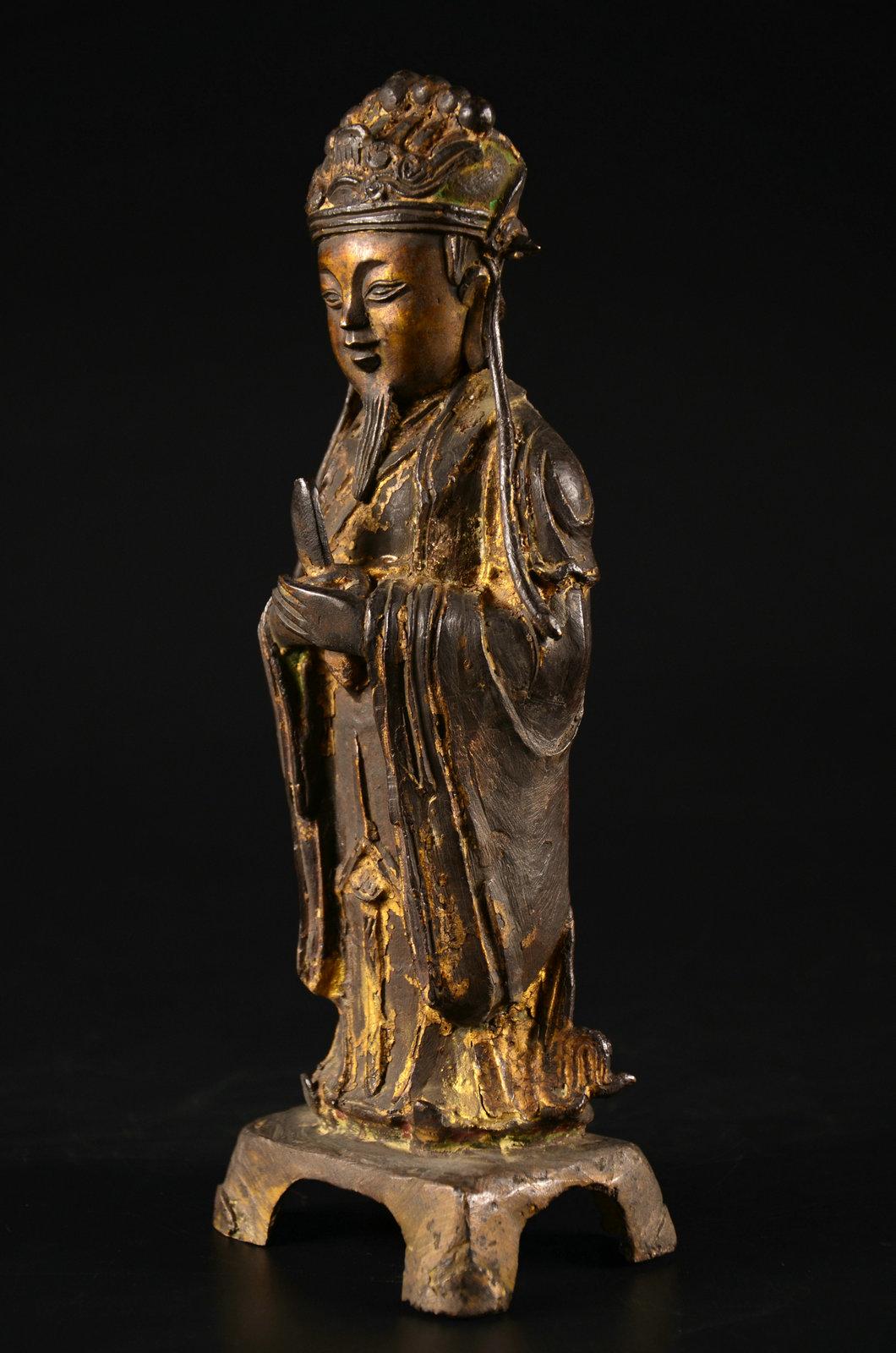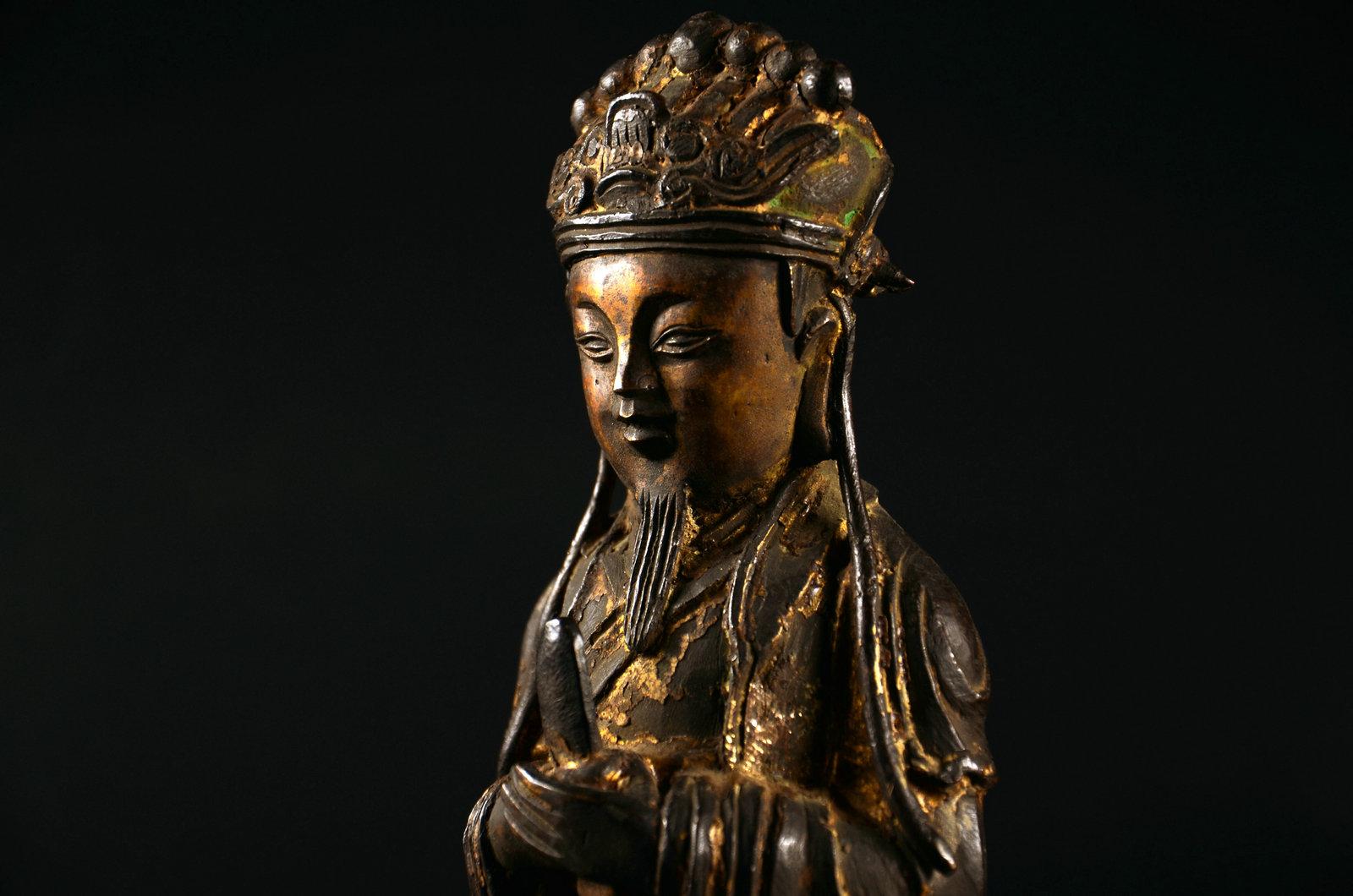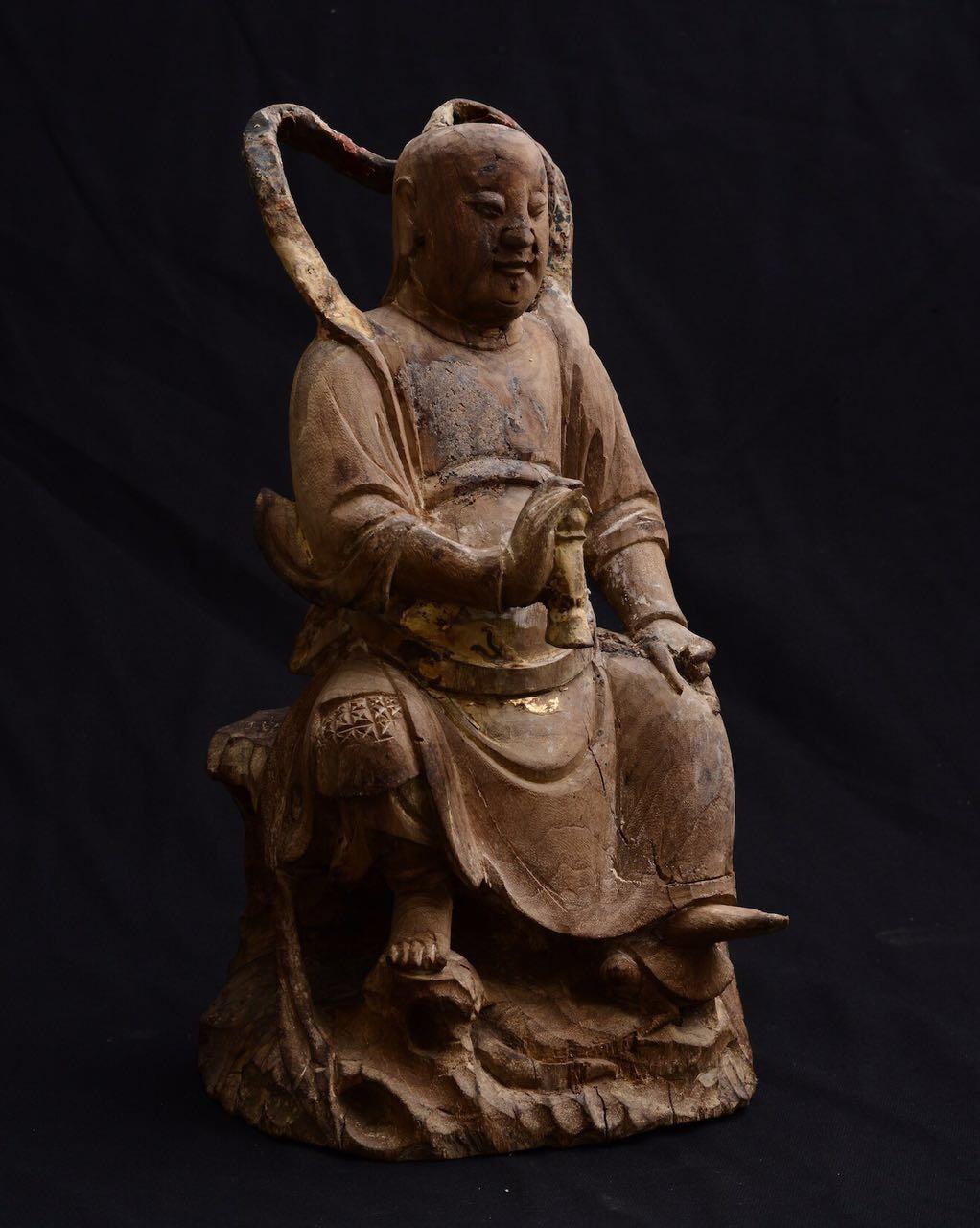 我不玩木造像,以及……所有的宗教造像,这个断代是前任主人告诉我的,不要问我依据。在一个私人文玩群拍得的。当时就觉得开脸真好,就要了。外表贴金基本脱落,残存少许,剑身也没了,以后找时间做个剑身接好它吧。