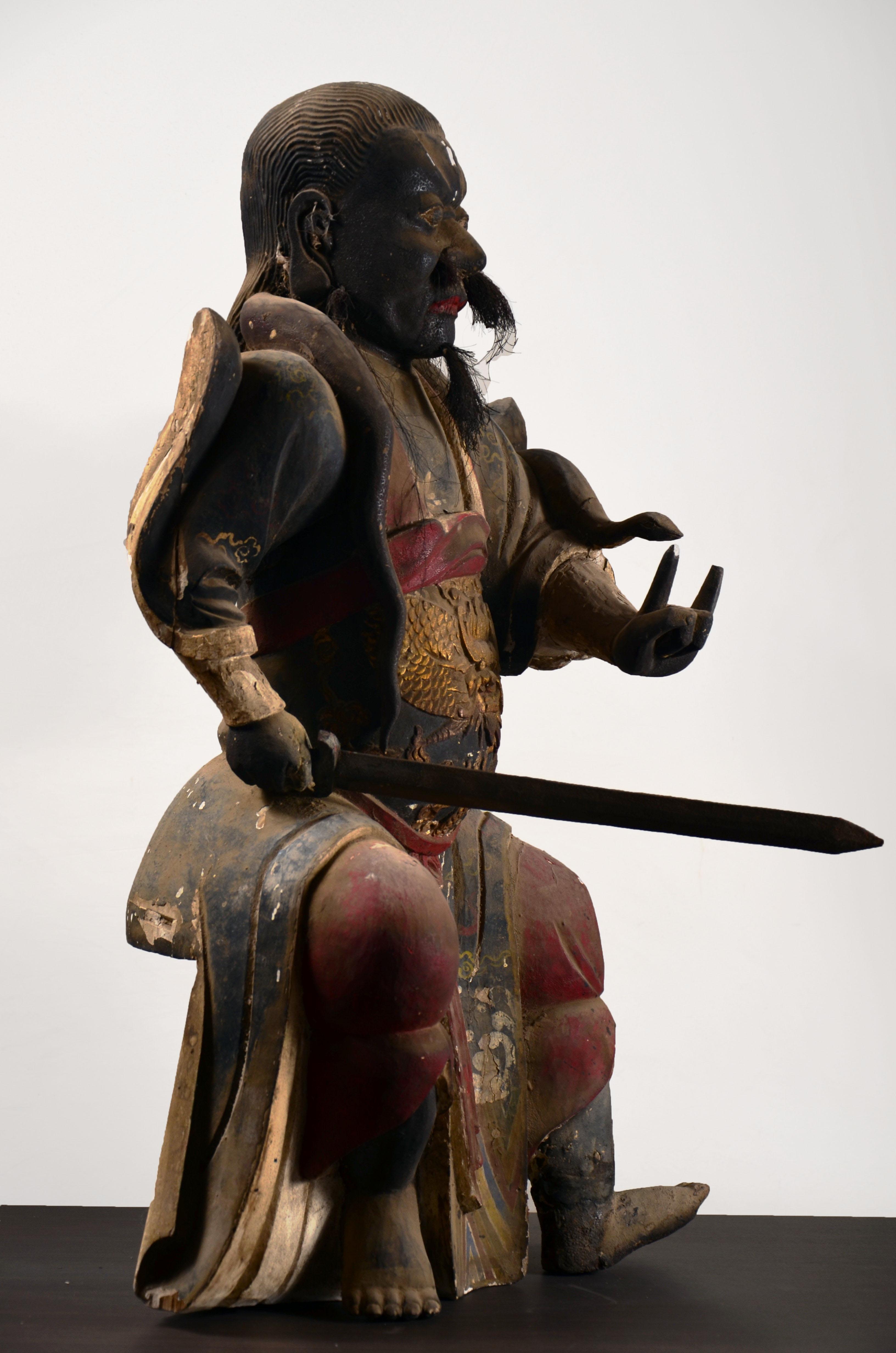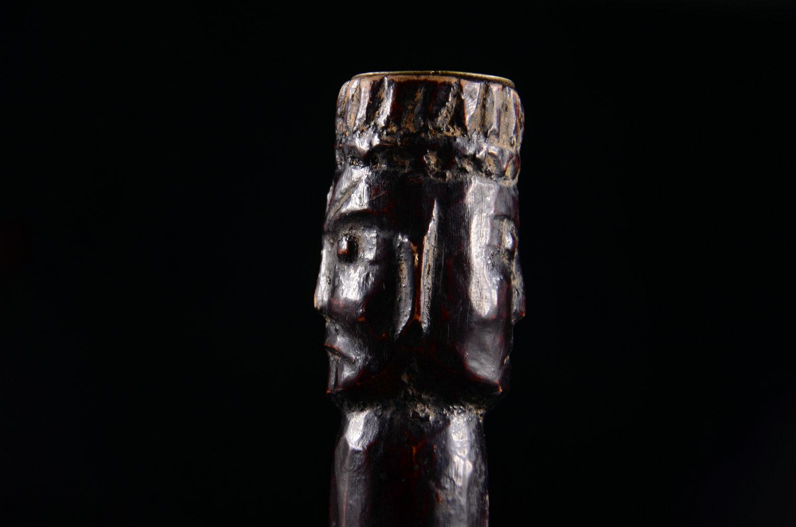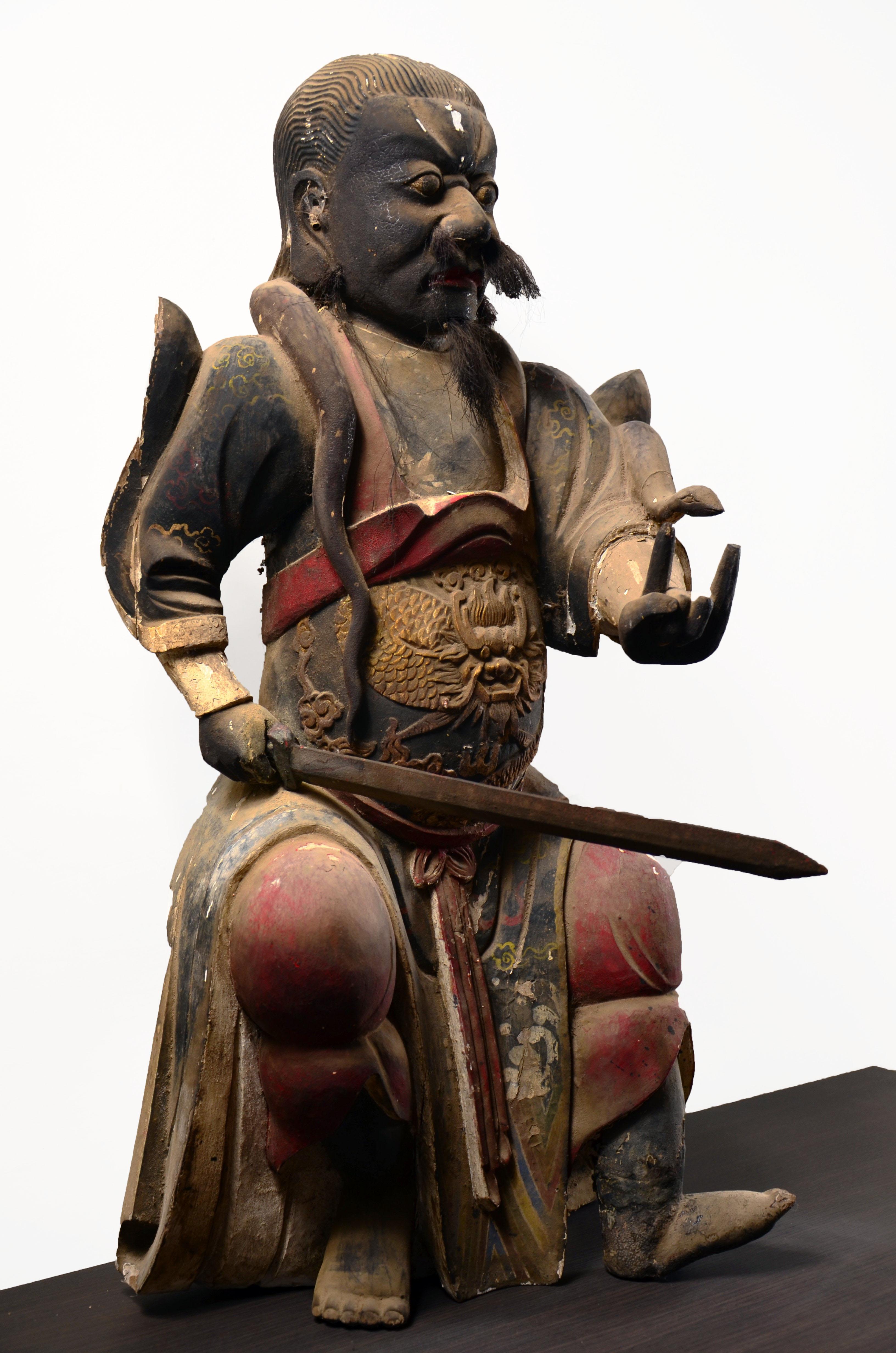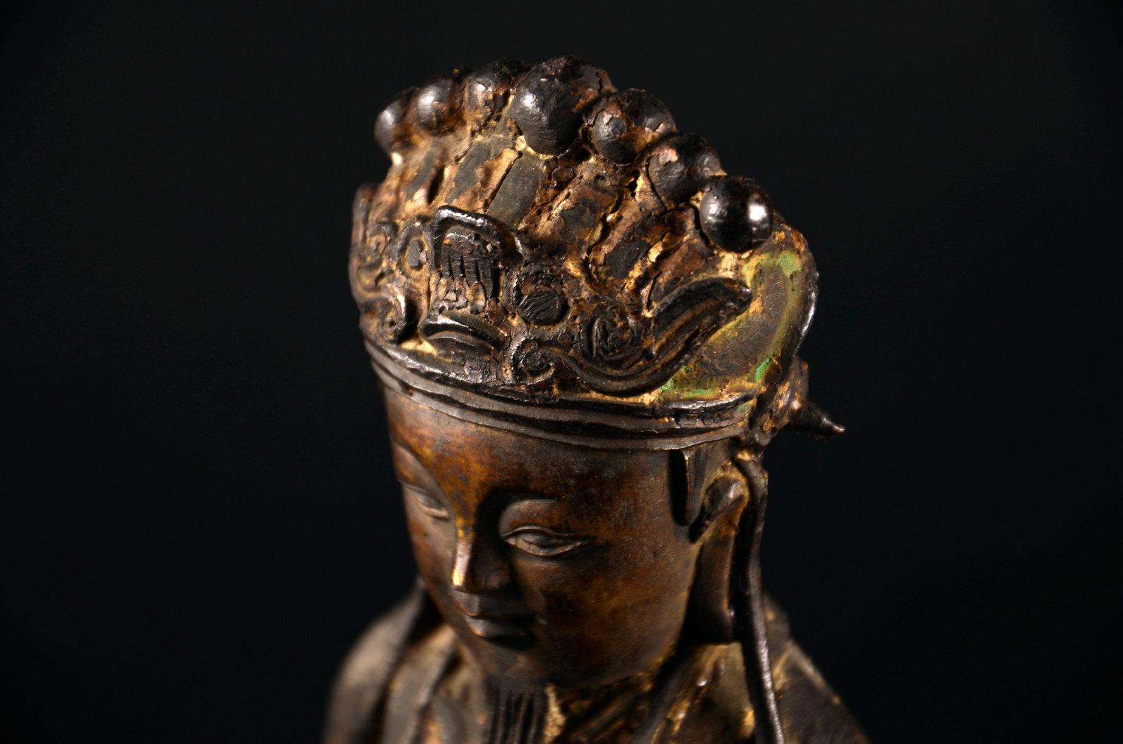 我不玩木造像,以及……所有的宗教造像,这个断代是前任主人告诉我的,不要问我依据。在一个私人文玩群拍得的。当时就觉得开脸真好,就要了。外表贴金基本脱落,残存少许,剑身也没了,以后找时间做个剑身接好它吧。