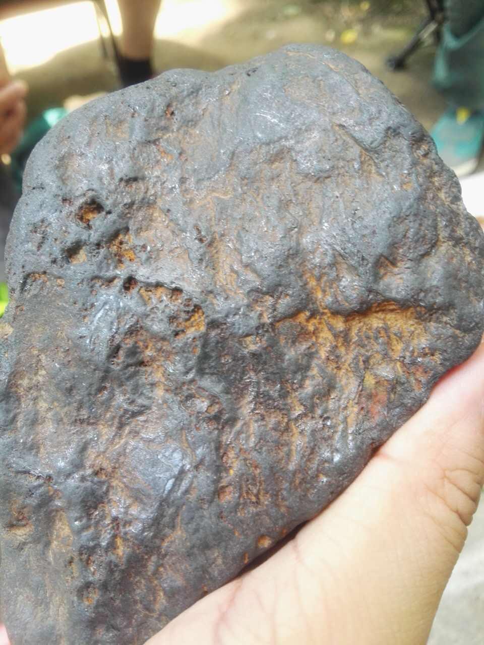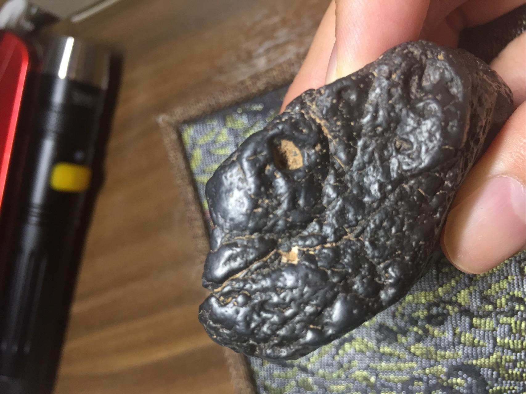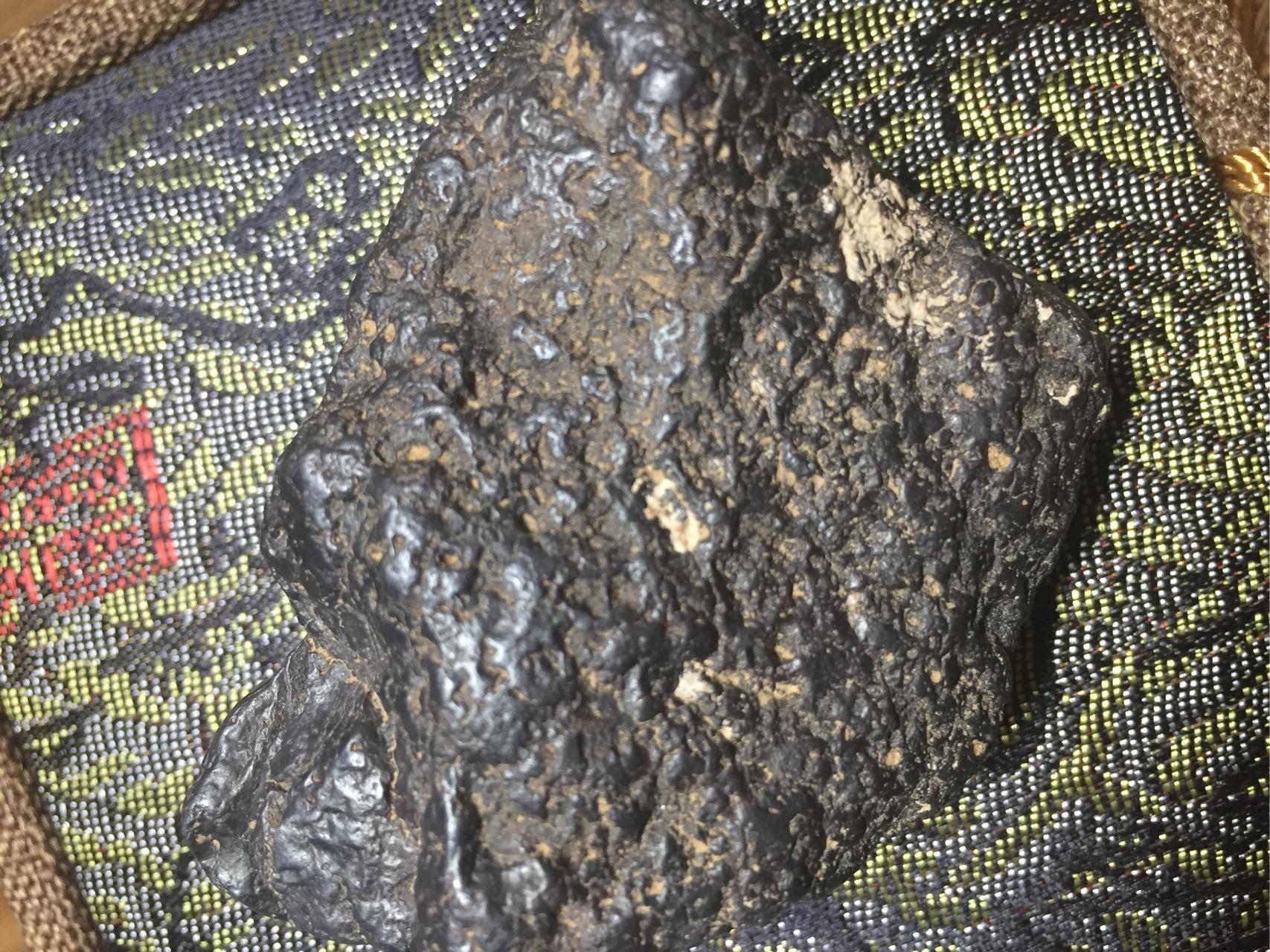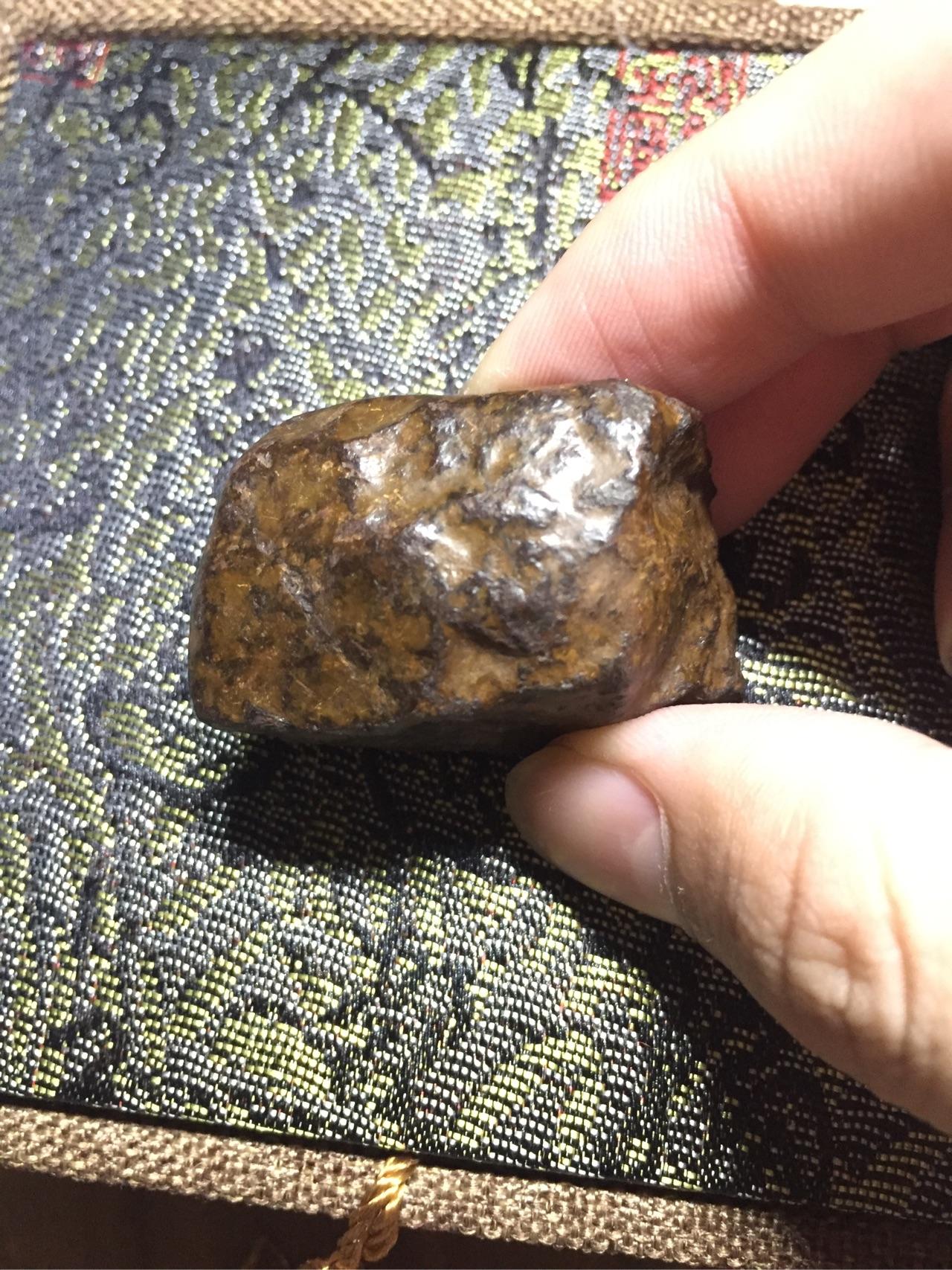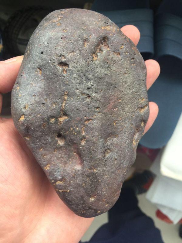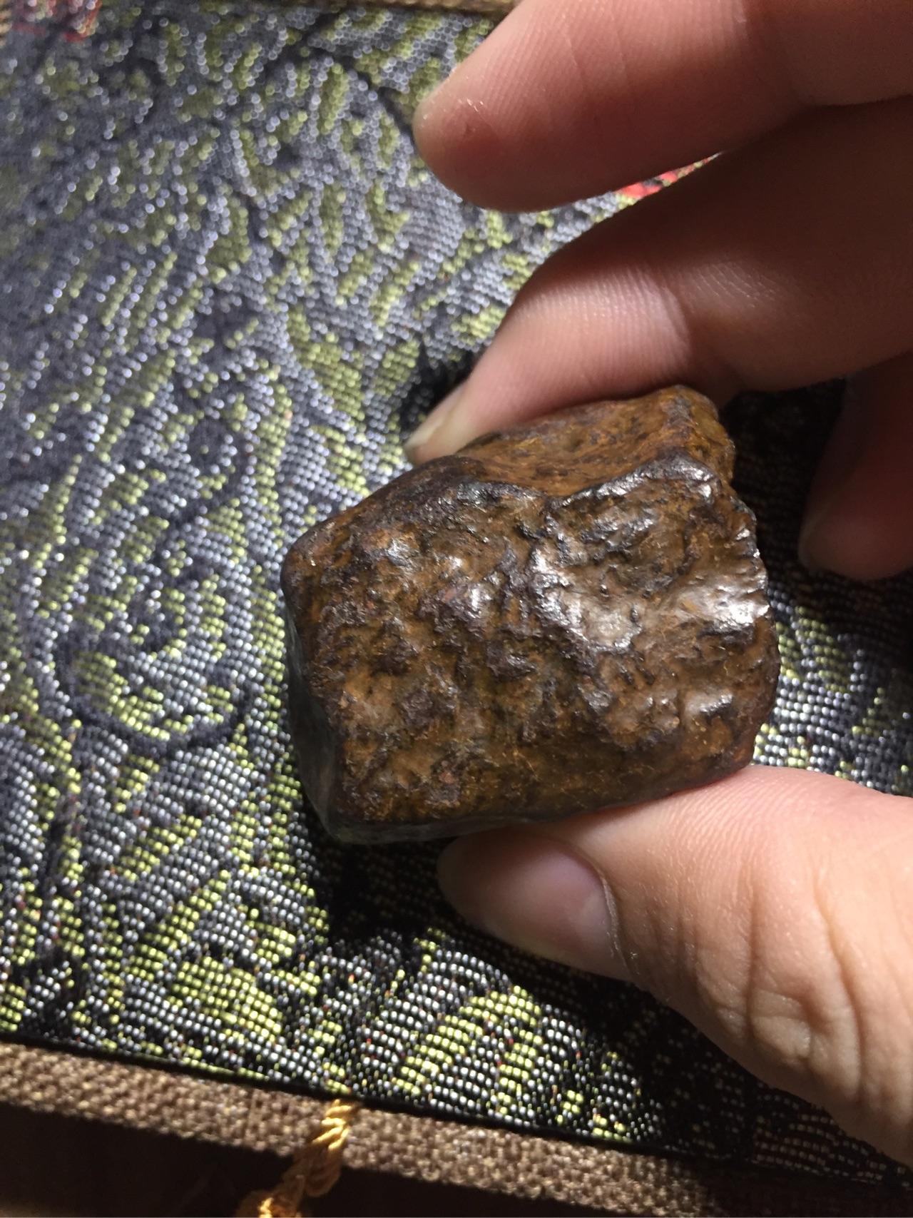 这块其实光看图片跟陨石很像了!但是请注意,第一,他的皮壳光泽没有金属的那种光泽。第二,就是。。。。我拿着没有陨石那种分量啊,陨石的密度远远大于地球上的石头,密度和硬度都很大。所以这块只是一个阿拉善的玛瑙石头而已。