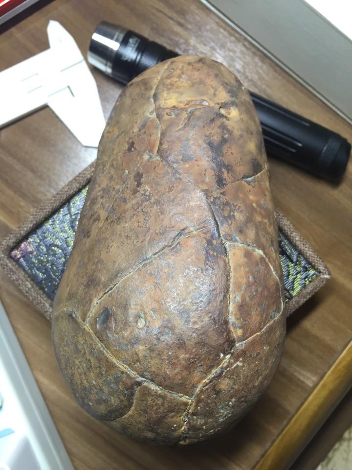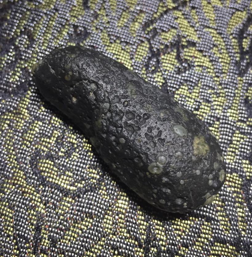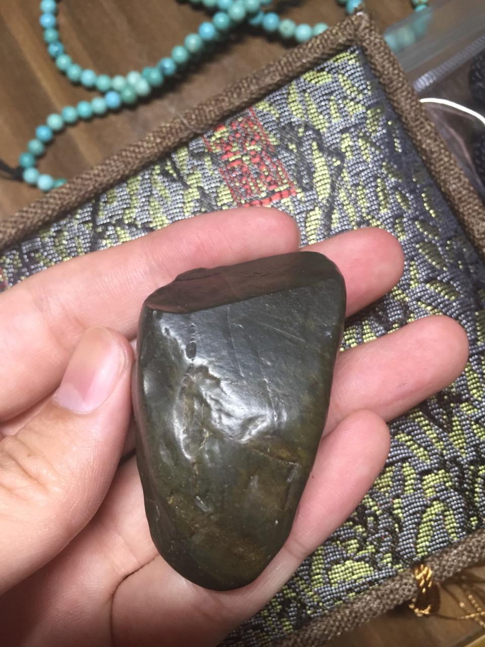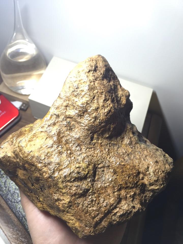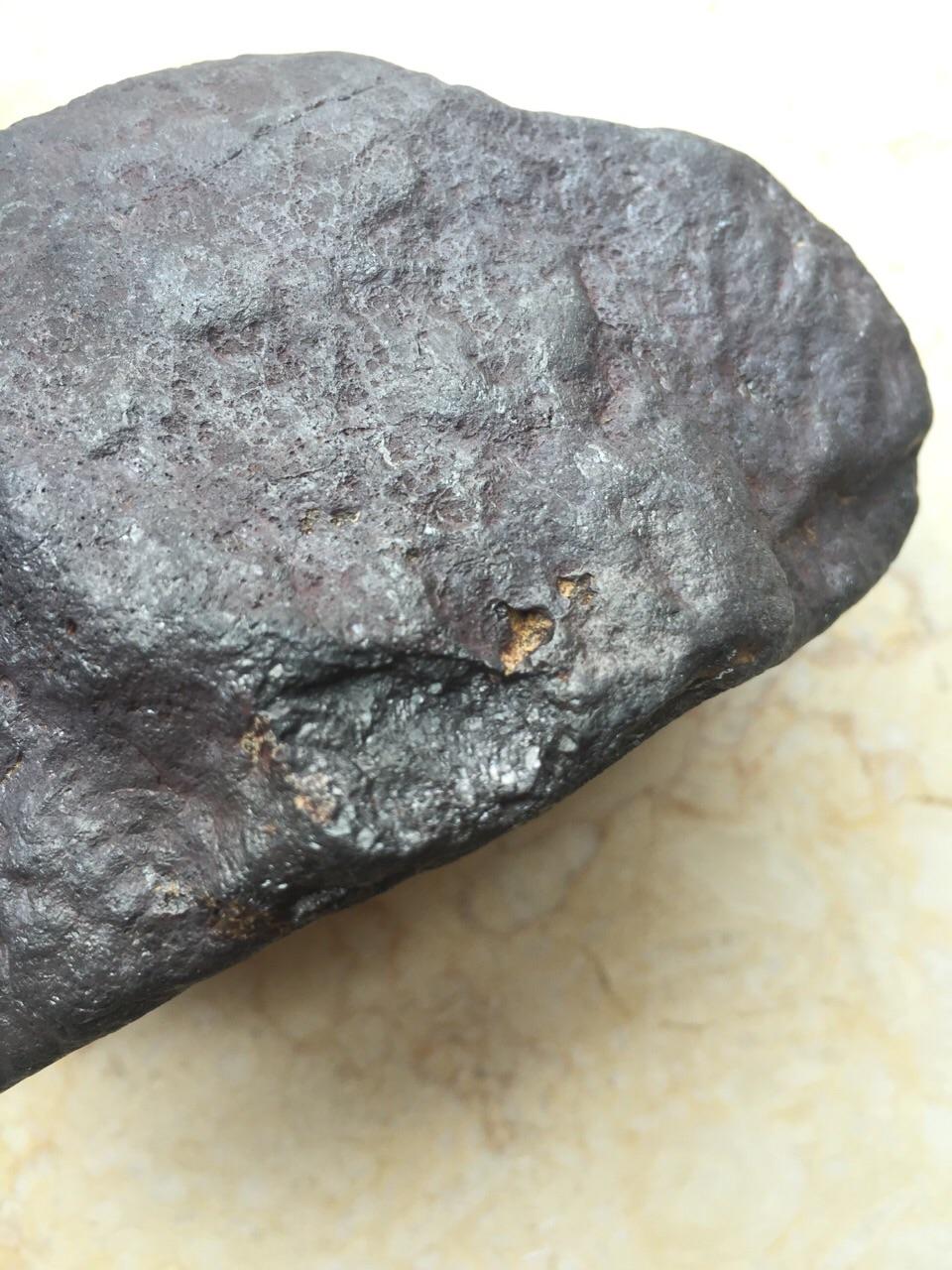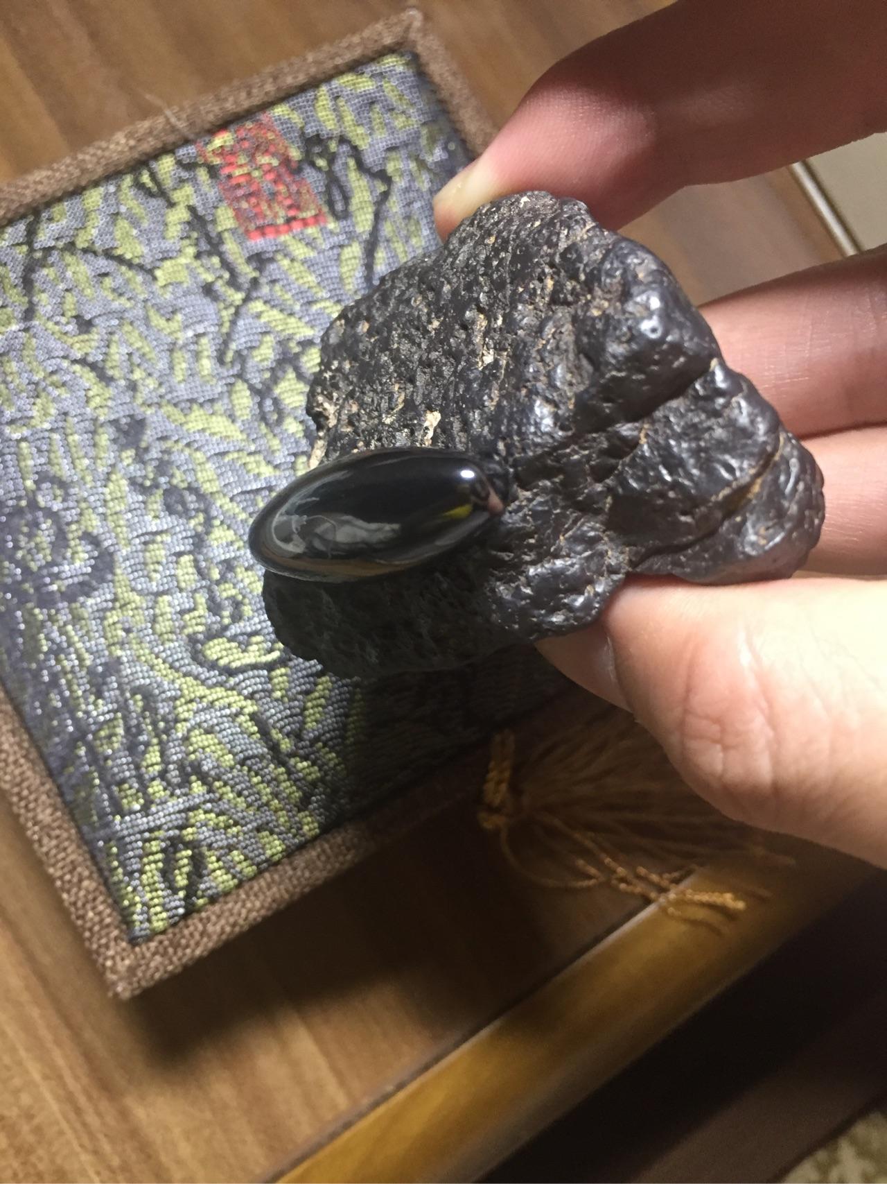 这块其实光看图片跟陨石很像了!但是请注意,第一,他的皮壳光泽没有金属的那种光泽。第二,就是。。。。我拿着没有陨石那种分量啊,陨石的密度远远大于地球上的石头,密度和硬度都很大。所以这块只是一个阿拉善的玛瑙石头而已。