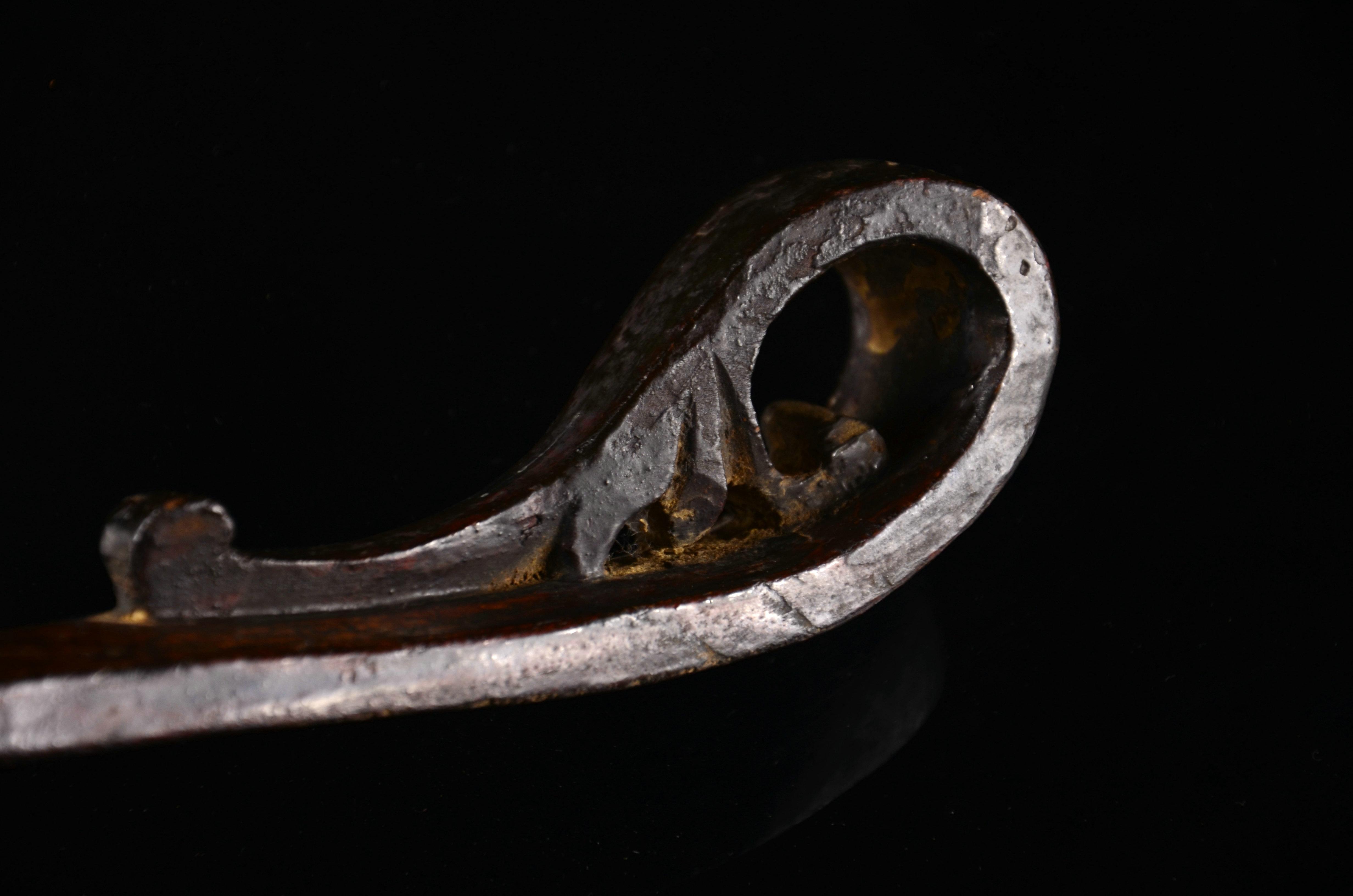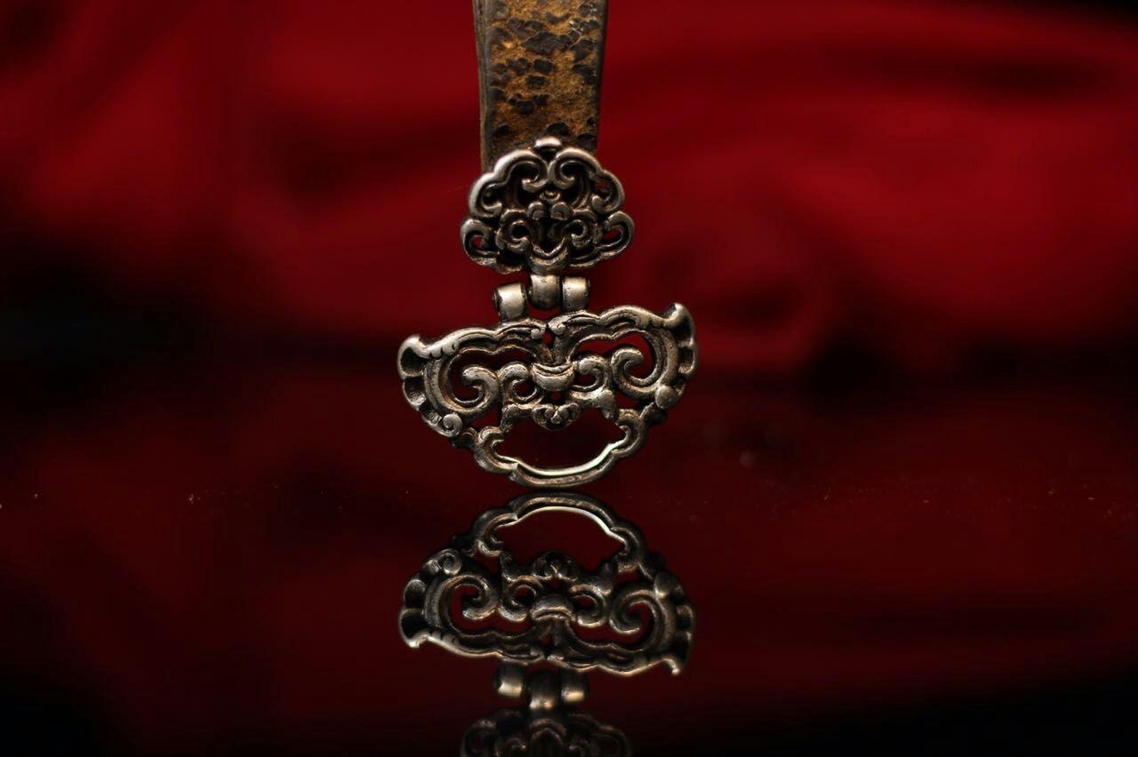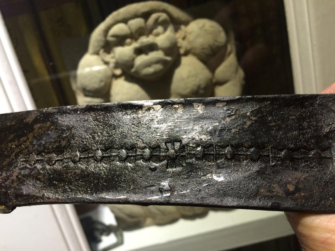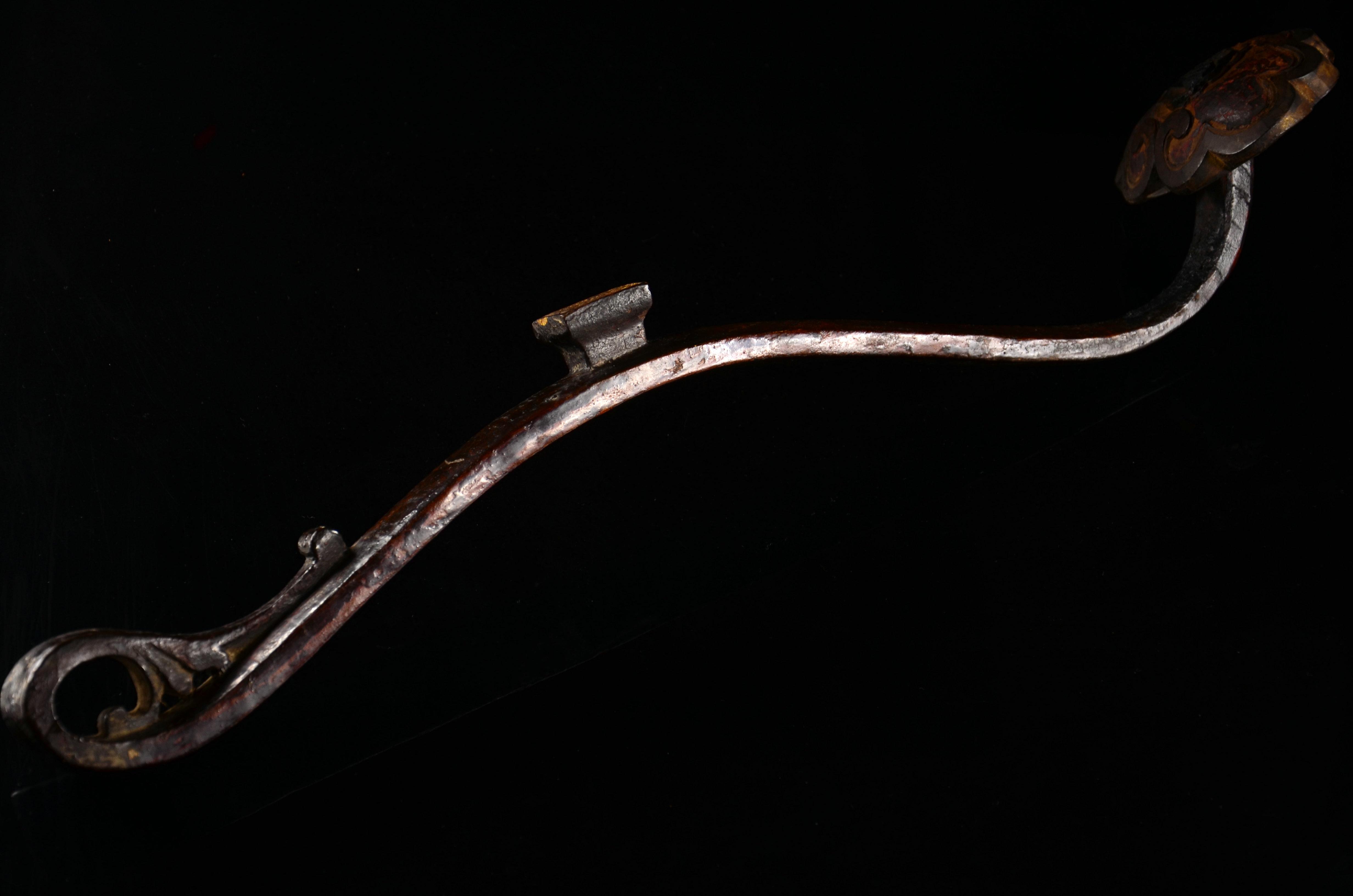 这是比较典型的元代战刀,还是直身,属于元代早、中期,和宋时期比较接近的形制。格是非常标准的中亚西亚一带的十字格,铜制,做工非常精良。鞘口和一个吊环尚在,一直没空清出来剥离,等有空在说吧……
