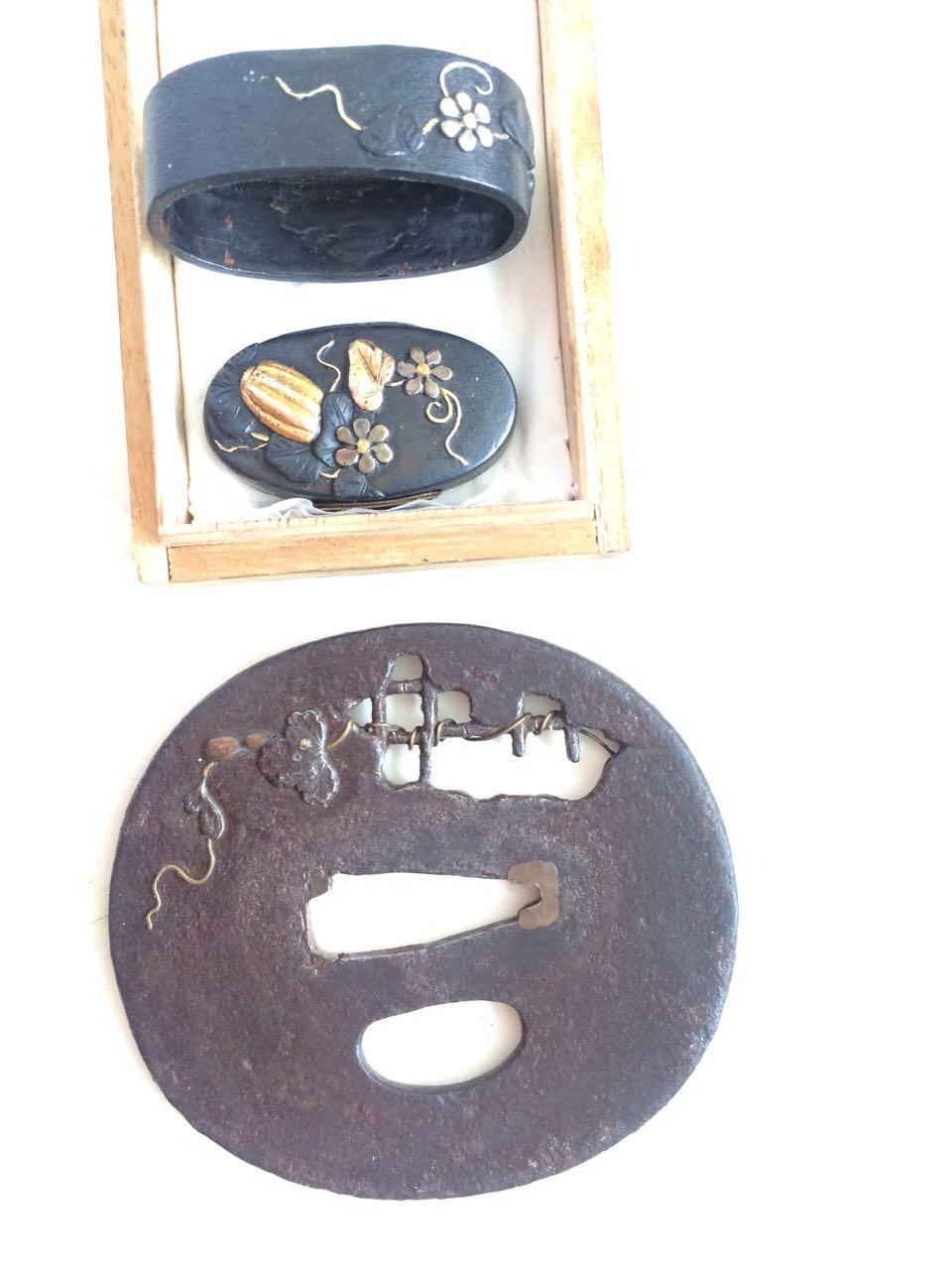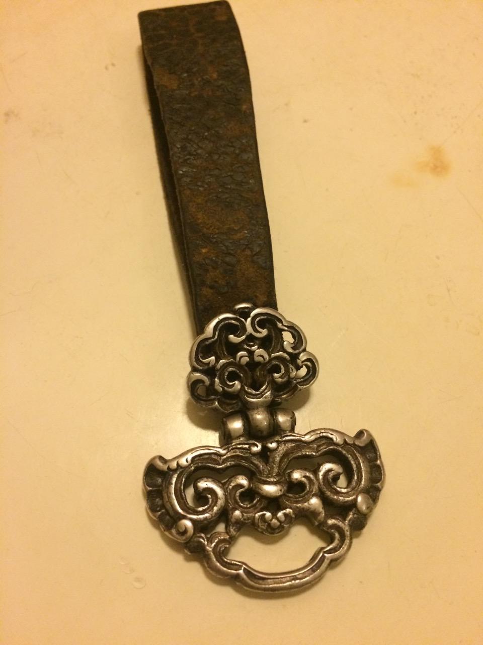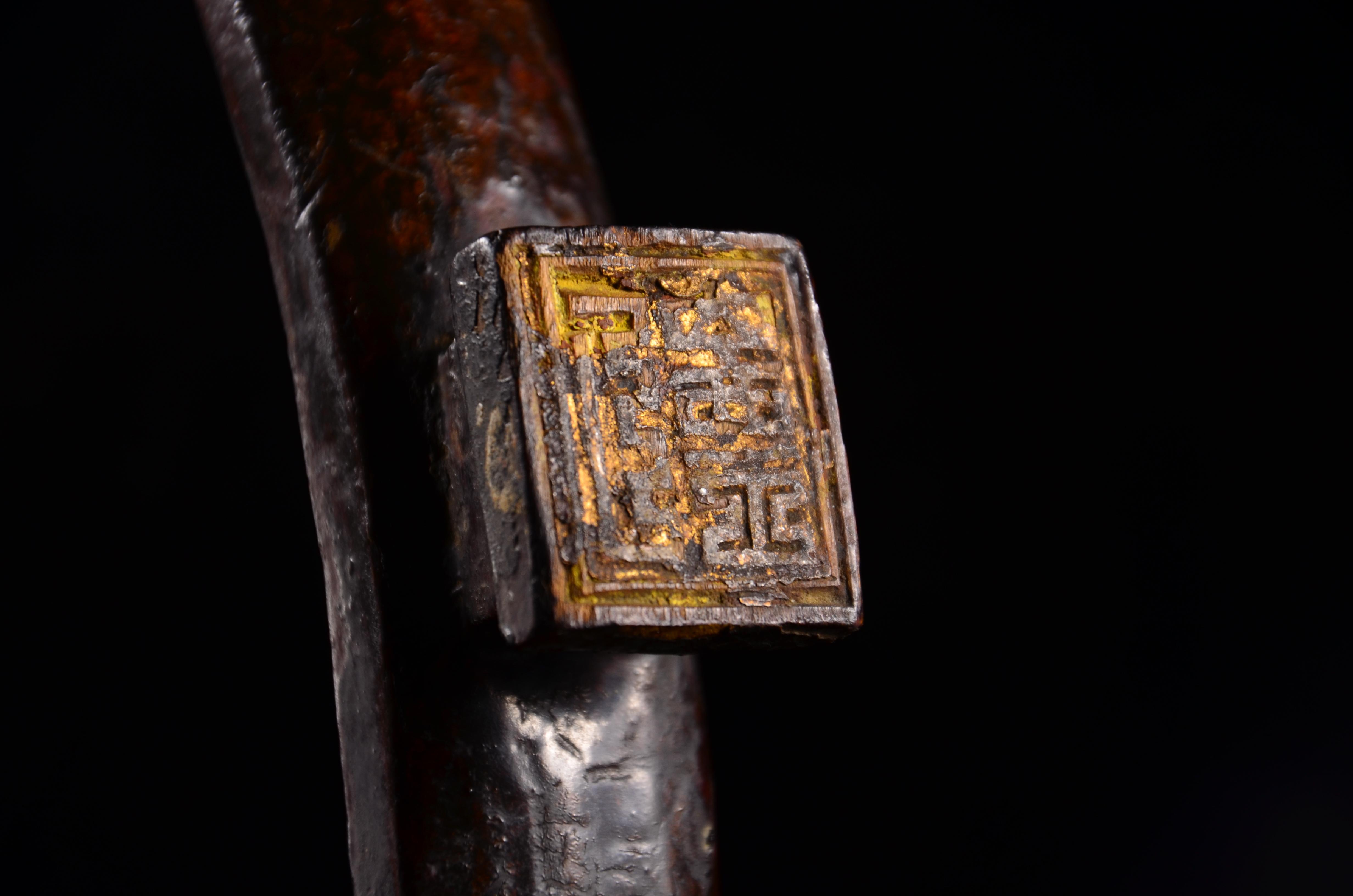 这是比较典型的元代战刀,还是直身,属于元代早、中期,和宋时期比较接近的形制。格是非常标准的中亚西亚一带的十字格,铜制,做工非常精良。鞘口和一个吊环尚在,一直没空清出来剥离,等有空在说吧……