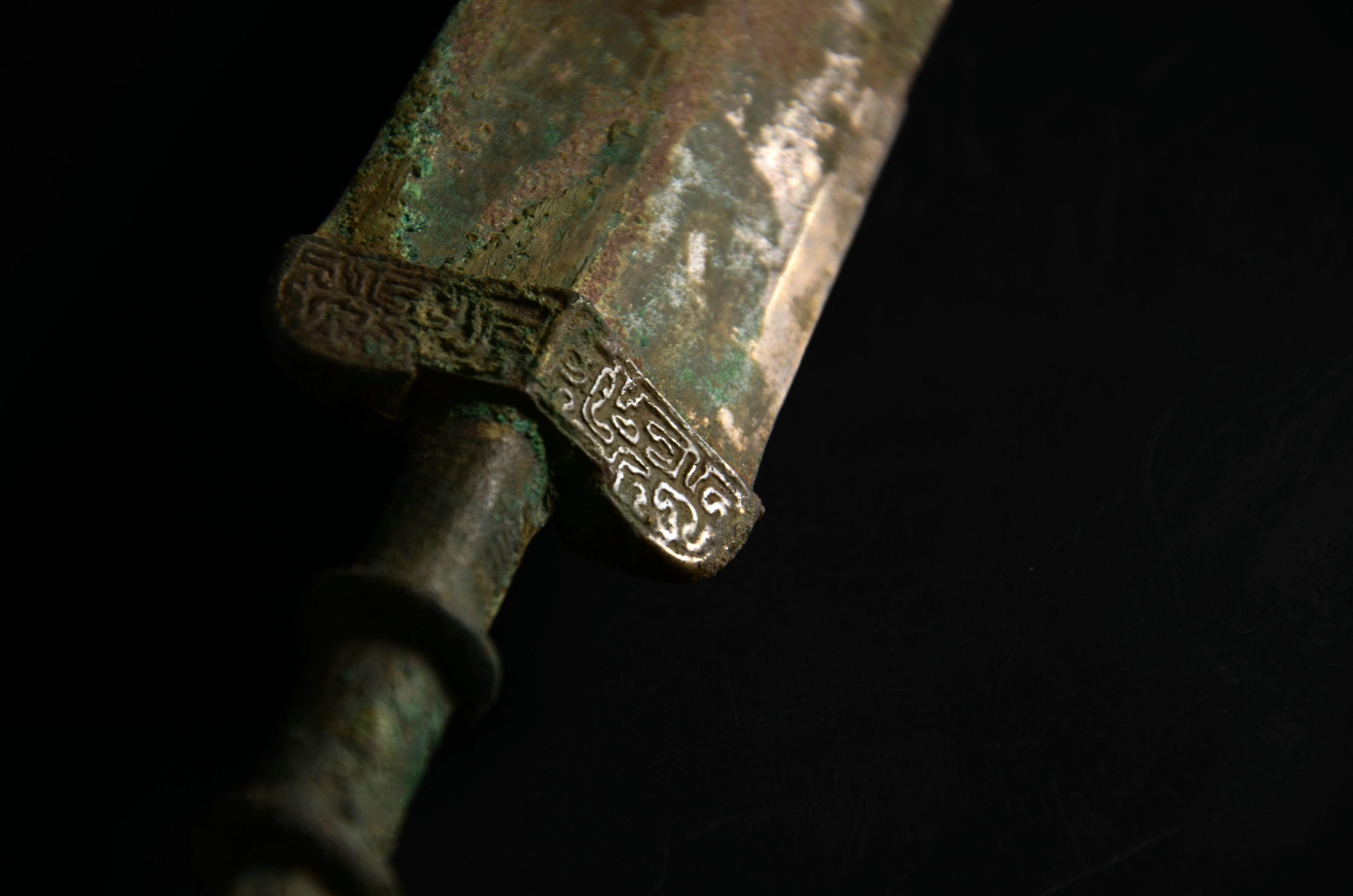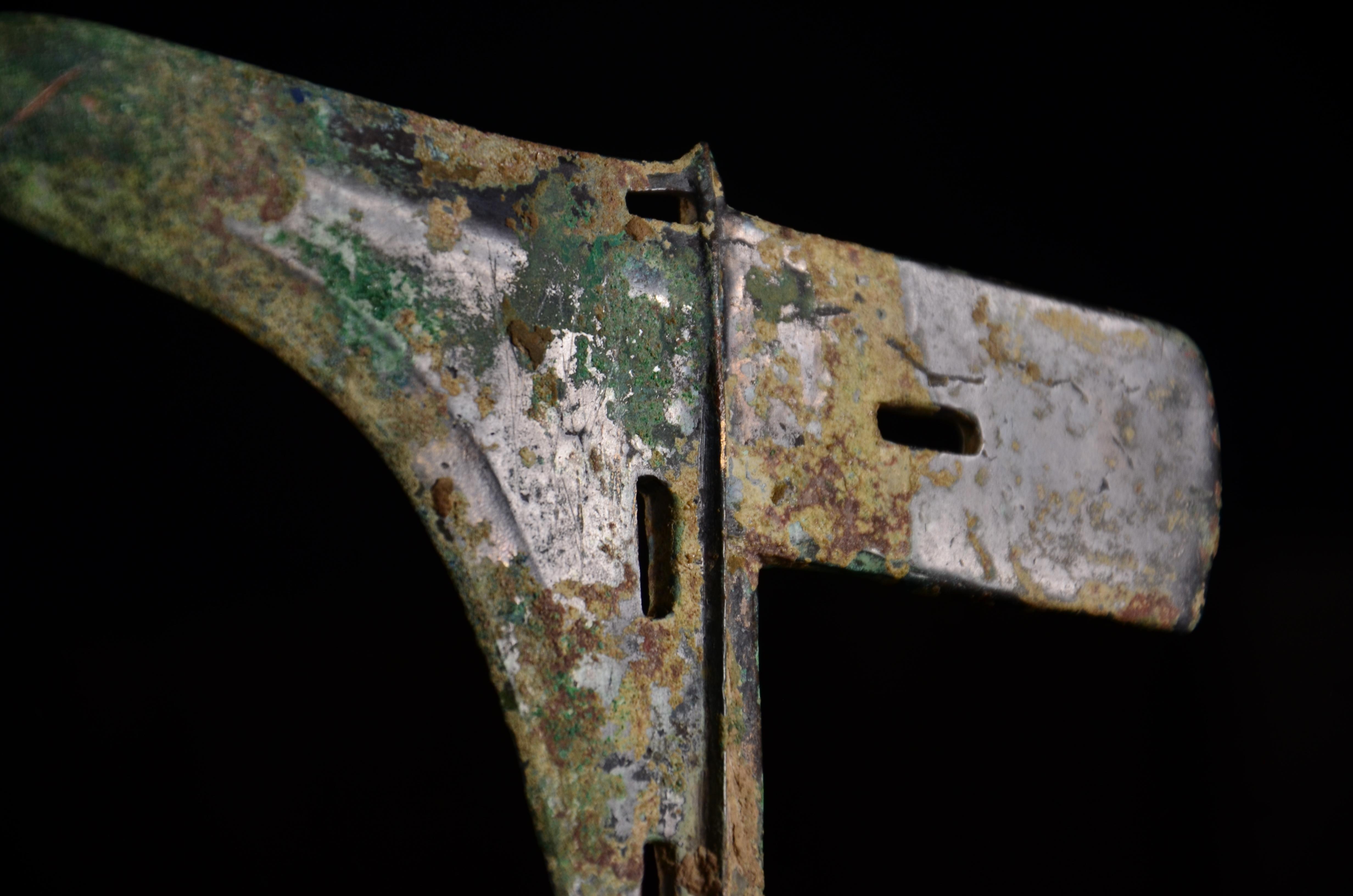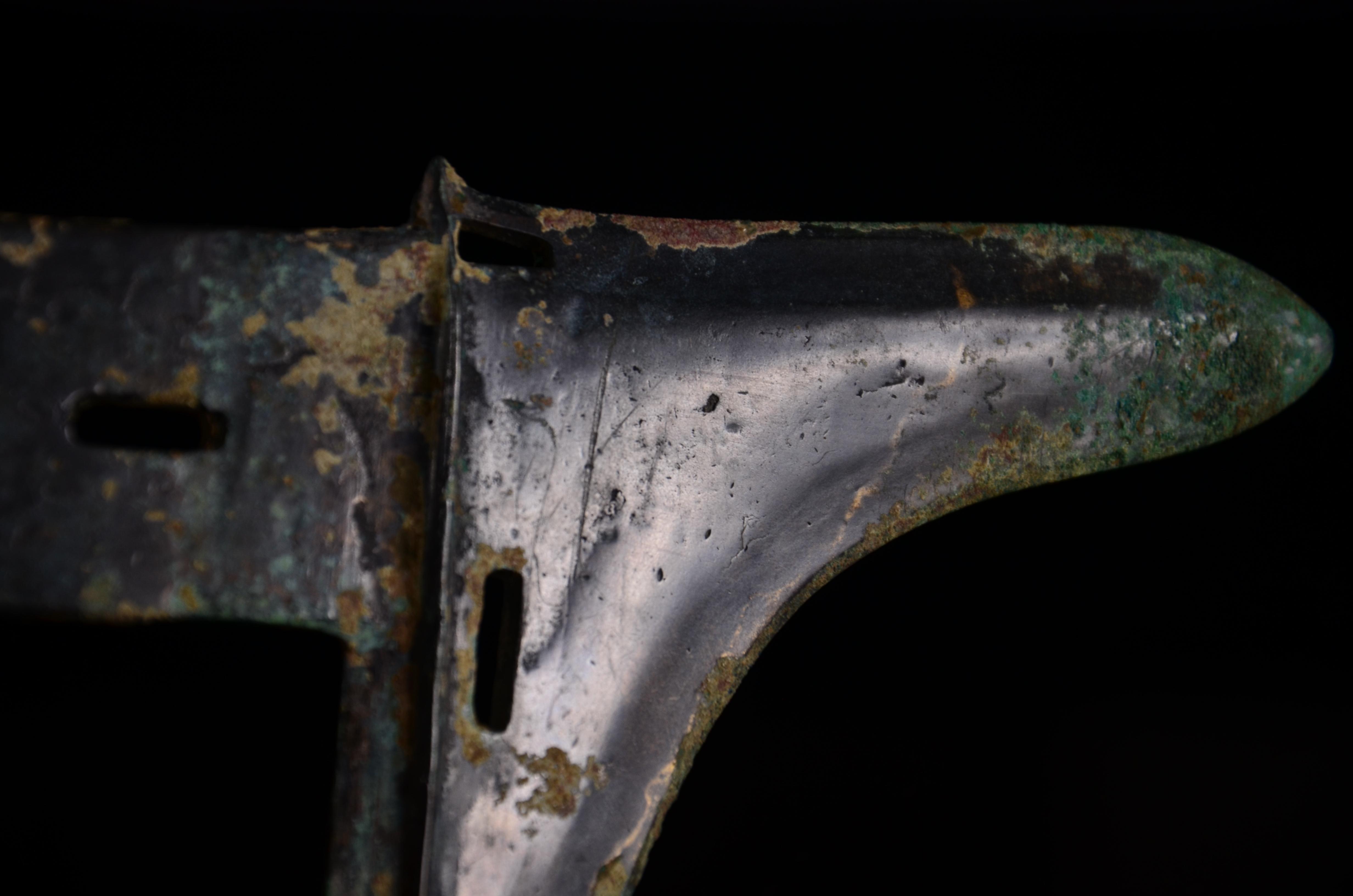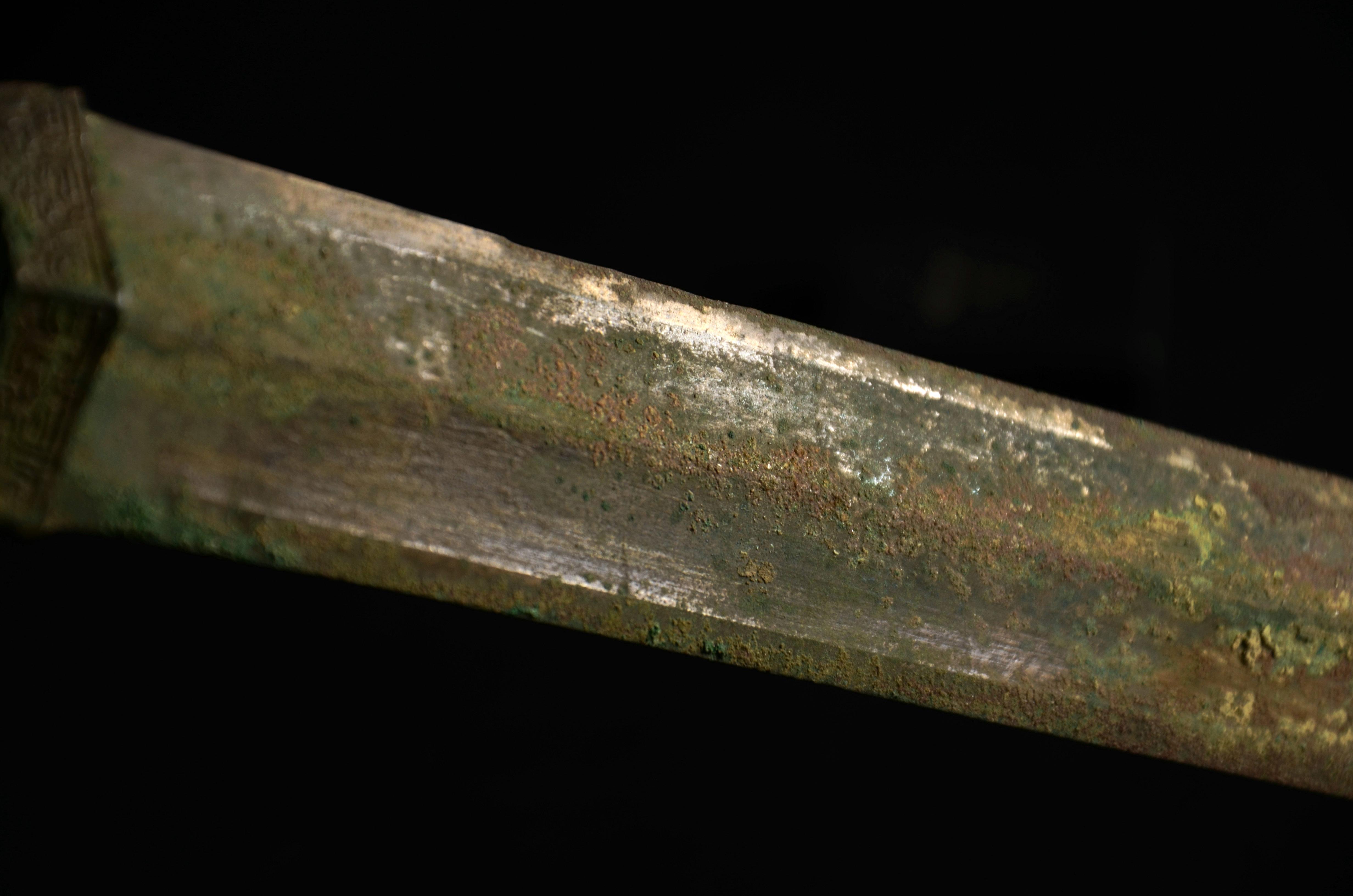剑身有两处小伤,被人为处理过。缺口内有明显的规则的打磨痕。推断是在战场上出现的战损,准备修补进行了初步处理,但可能主人突然去世,于是没来得及进行完整修补就被殉葬了。