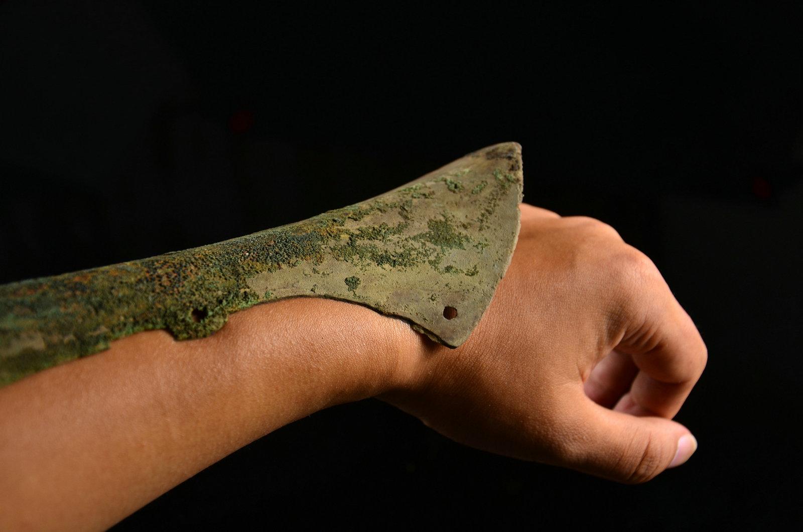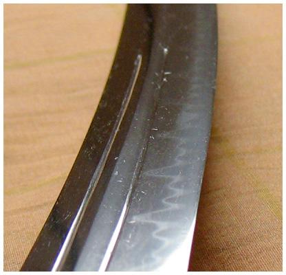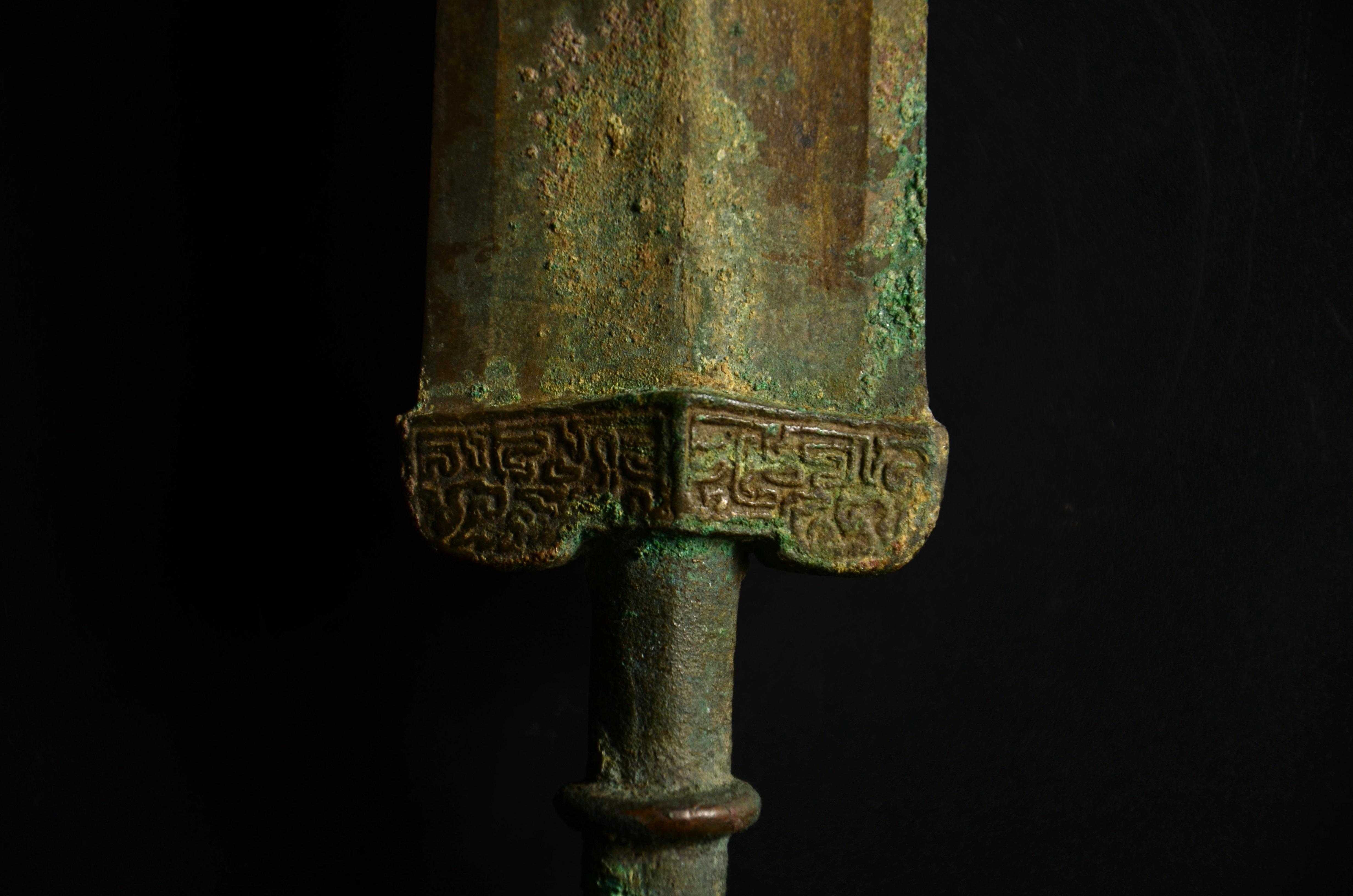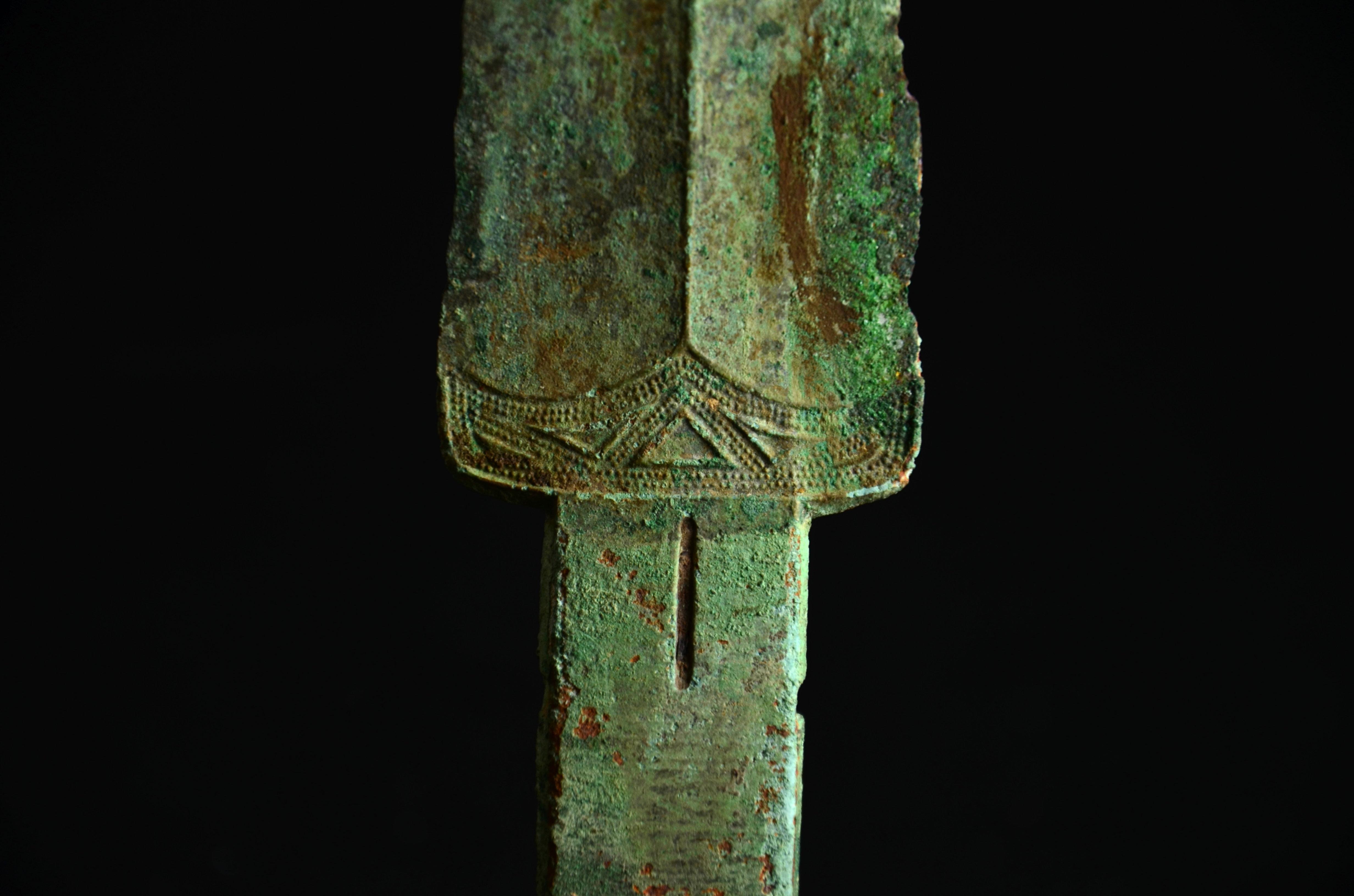 剑身有两处小伤,被人为处理过。缺口内有明显的规则的打磨痕。推断是在战场上出现的战损,准备修补进行了初步处理,但可能主人突然去世,于是没来得及进行完整修补就被殉葬了。