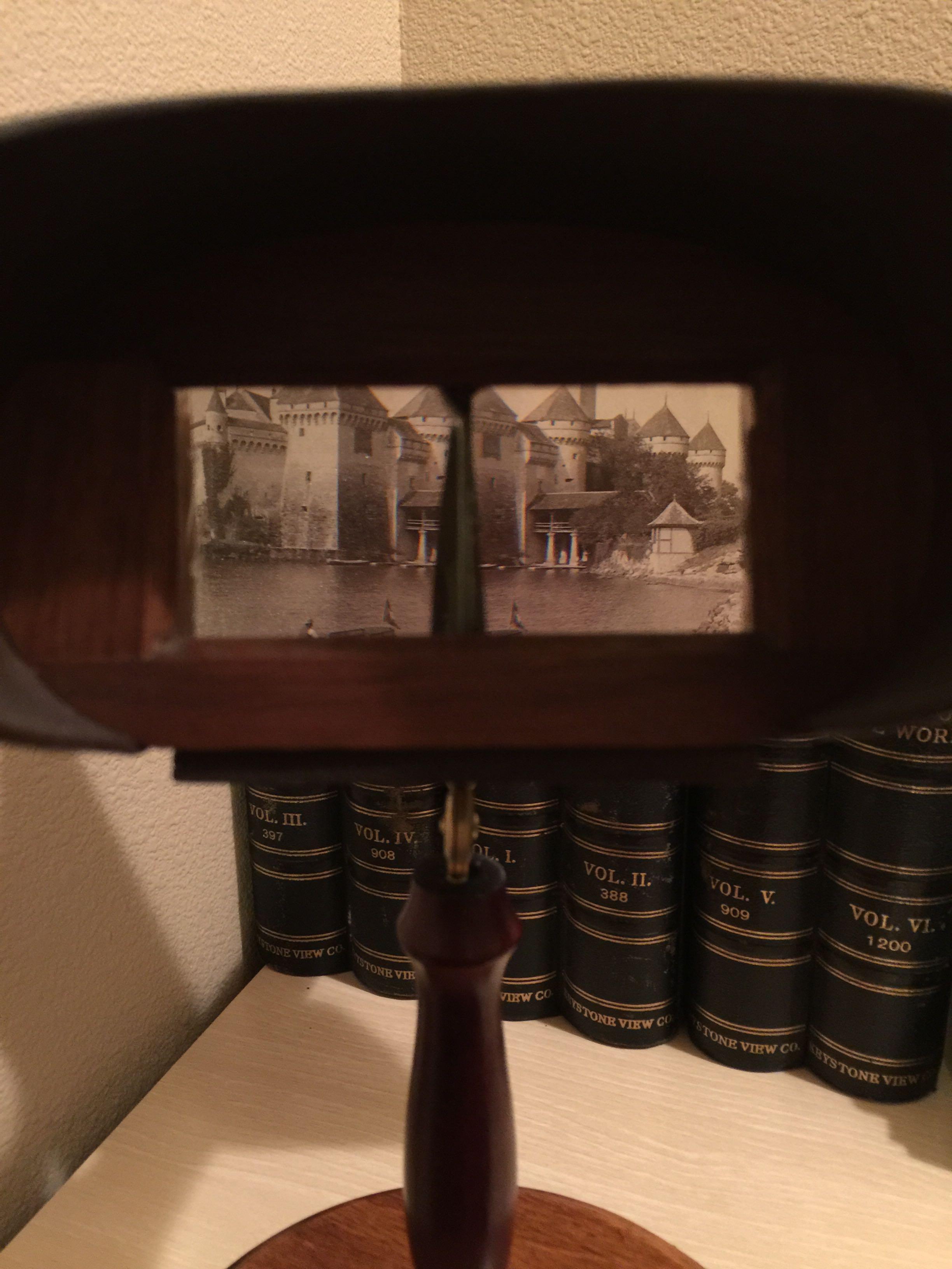 原理应该跟stereoview差不多,也是利用两眼的视觉差。使用时把胶片塞进上方的插口,按动黑色把手就可以看了。每张胶片有七个景点。和简陋的外表比起来,立体/临场感出乎意料地强,尤其当你对着光源稍微调整下角度时,会有变亮/变暗的效果,像是天上刚刚飘过一团云的感觉。