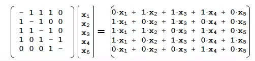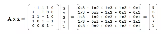 现在考虑x,一个5x1的向量,向量的值对应图中的每个点。在这种情况下,我们计算的是每个点的点度中心性(degree centrality),即以点的连接数来衡量中心性的高低。