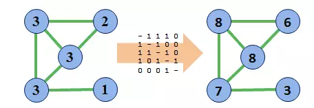 考虑下面的图,以及相应的5x5的邻接矩阵(Adjacency Matrix),A。