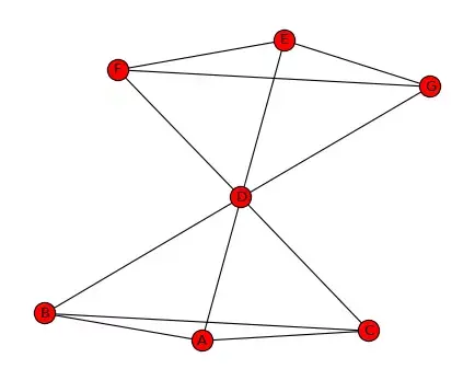 计算网络中任意两个节点的所有最短路径,如果这些最短路径中很多条都经过了某个节点,那么就认为这个节点的中介中心性高。回到上面的蝴蝶结网络,假设我们要计算节点D的中介中心性。