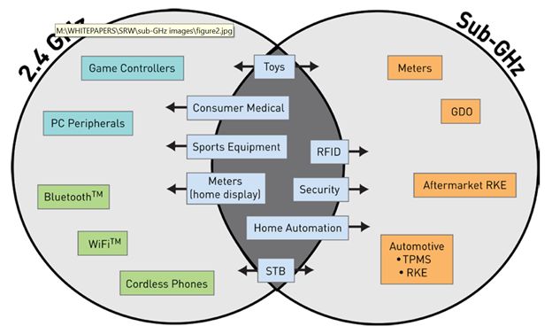 Sub-1G和2.4G有各自应用的领域,也有很多重合的领域。例如在例如玩具,医疗设备,建筑自动化领域,二者都被广泛使用,但在需要传输视频的地方,使用2.4GHz,而在一些压力或者加速传感器则使用sub-1GHz技术。