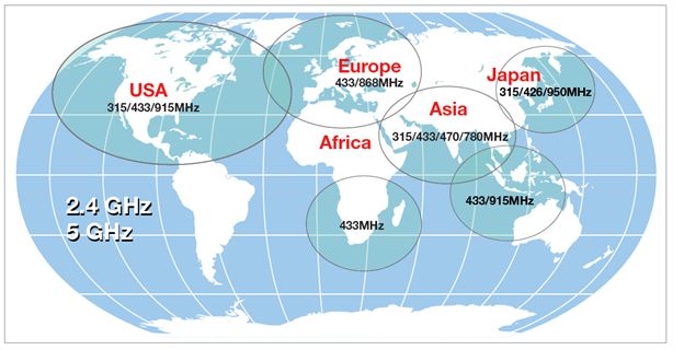 为了协调无线电频谱在全球的共享使用,国际电信联盟(The International Telecommunication Union,ITU)中的无线通信部门(ITU-R)为工业(industrial)、科学(scientific)以及医学(medical)应用预留了几个频段,称为ISM频段。 ISM频段是不需要授权的,但是各个国家又有差异,目前,ISM频段包括433MHz,868MHz,915MHz,2.4GHz,5GHz。2.4GHz频段是各国共享的ISM频段,但900MHz频段在欧洲和中国用于GSM,是需要获得许可的(中国移动GSM使用的900MHz和1800MHz频段)。