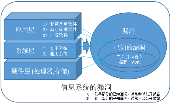 - 维基百科[7]: 计算机安全中,漏洞是威胁可以利用的弱点,例如攻击者可利用漏洞在计算机系统内跨越权限边界。