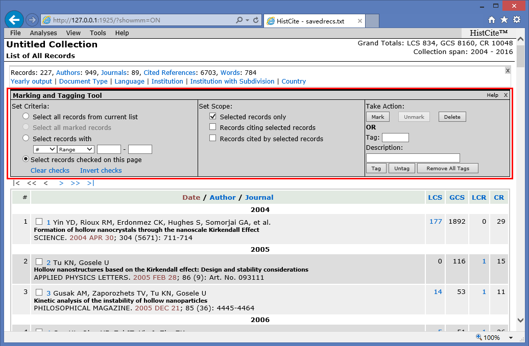 下图红框内就是标记选择工具栏。左边栏用于指定选择范围,可以选择当前列表中的全部文献,也可以按照序号(#)、LCS、LCR等数值的区间来选择文献,还可以手动勾选需要的文献。中间栏表示的是需要导出的信息范围,可以只导出记录本身,也可以选择导出引用的文献或者被引的文献。右边栏的【Mark】按钮就是确认选择按钮。