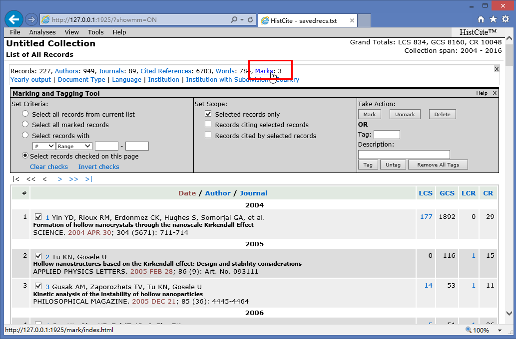 然后,我们就会发现上面出现了一个新的标签【Marks】,后面的数字就是我们选中的记录条数,如果发现这个数字不正确,点击【Mark】按钮旁边的【Unmark】来重新选择。确认无误之后,点击图示的【Marks】标签链接,即可显示全部被选的文献记录。