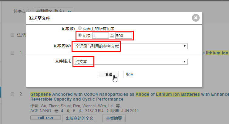 在弹出的菜单中,记录数填写1到500,因为每次最多只能导出500篇文献,所以上面的2819篇文献需要分成6次导出,后面导出的时候依次填写501到1000、1001到1500等等。。。记录内容选择【全记录与引用的参考文献】,文件格式选择【纯文本】,然后点击发送即可得到导出的 txt 文件,类似可以导出其他5个。