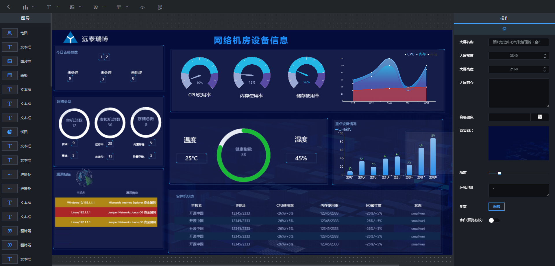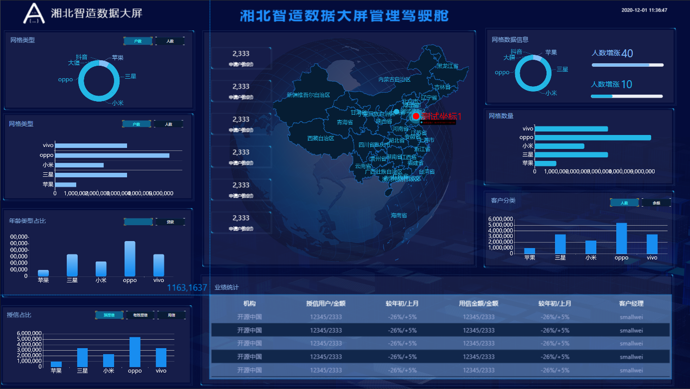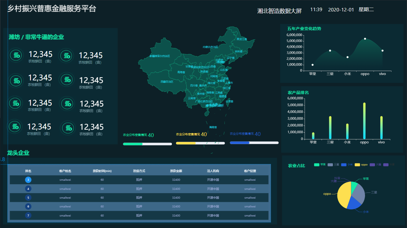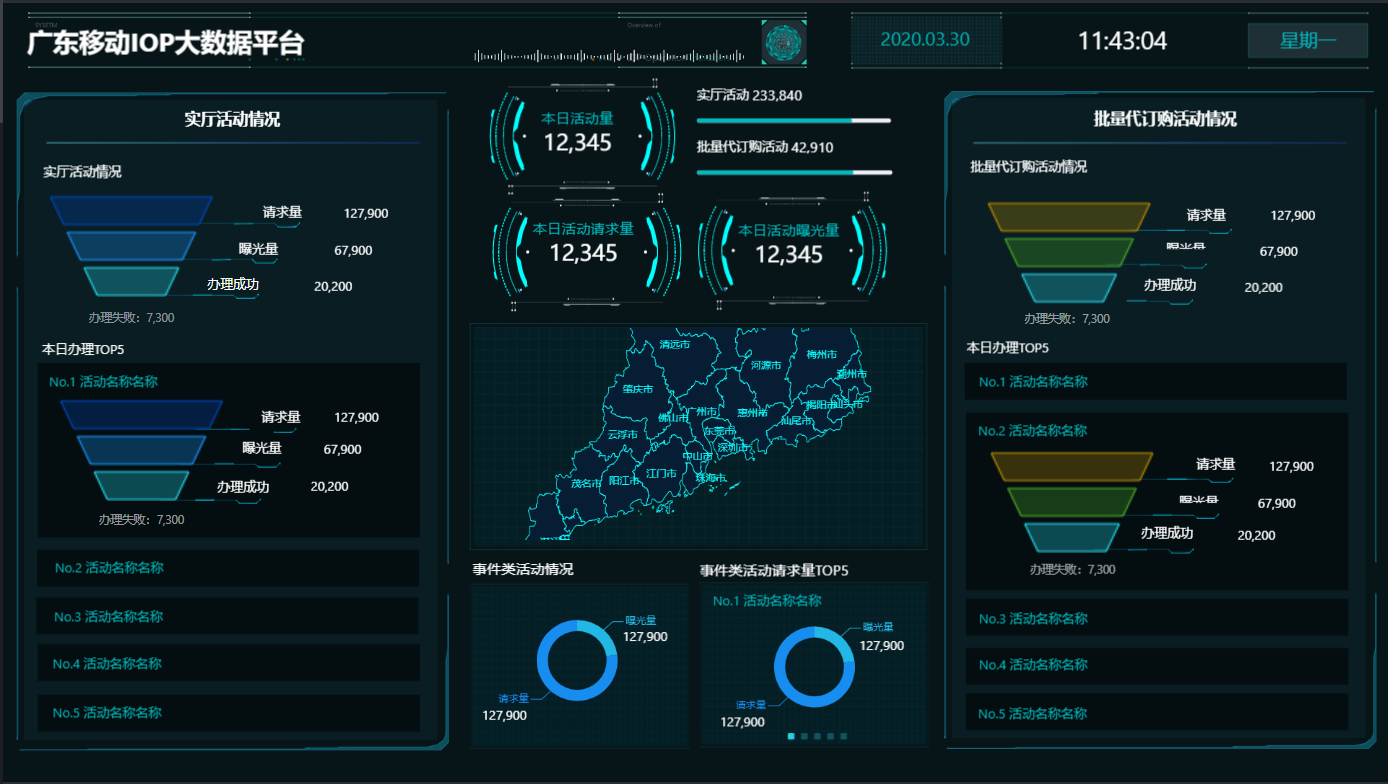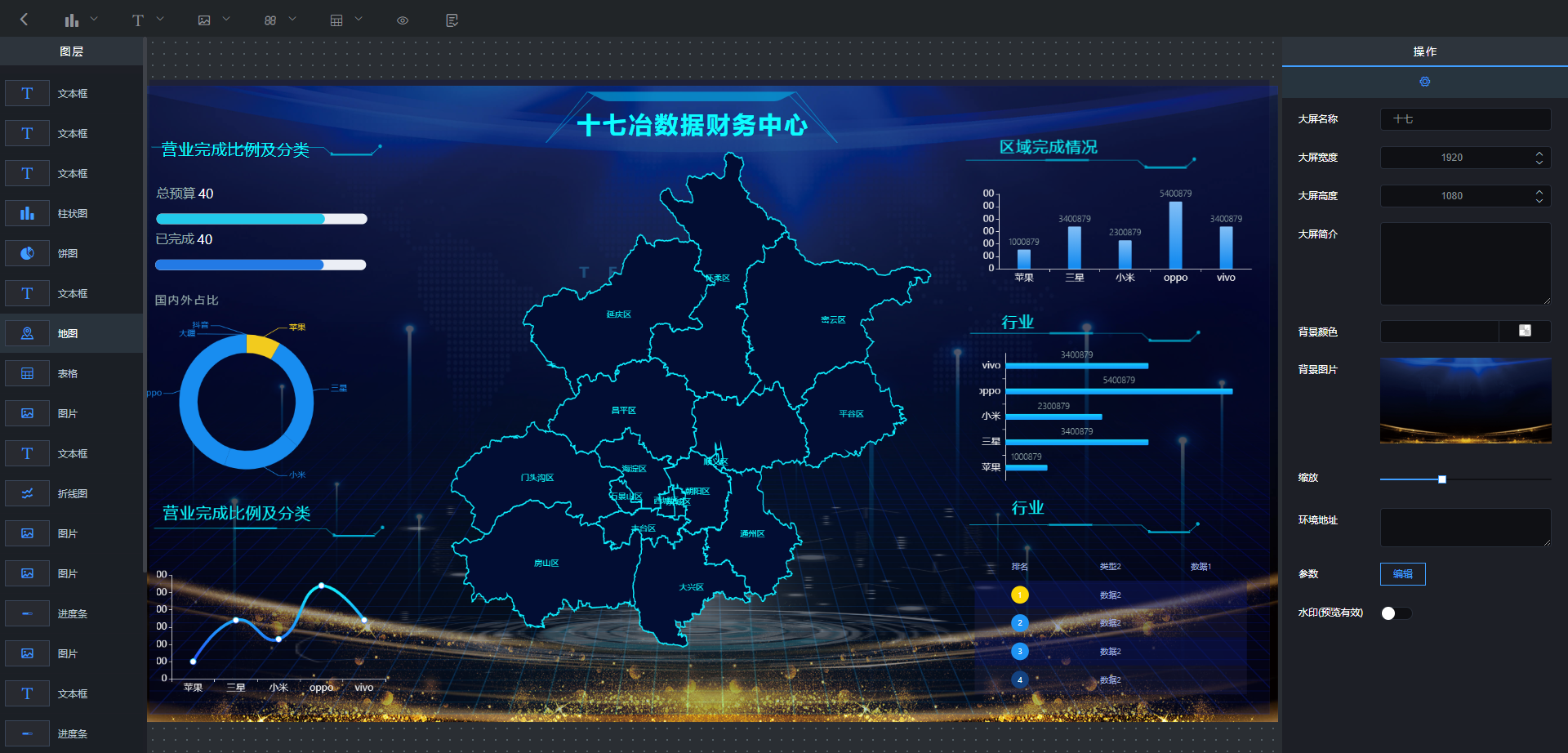 目前主要应用在以政府机关、商业机构、金融中心、实业制造等行业的业务场景中,大数据的价值在此得到充分展现。比如,数据大屏作为一种有效传递信息的手段,正在城市智能运营中心、应急指挥中心、执法监控中心、电力调度中心、金融交易大厅等部门和机构中承担起重要的角色。具备日常监测、分析研判、应急指挥、展示汇报等多种功能,在帮助开展科学管理工作等方面发挥作用。这里提供一些行业模板,以作参考。