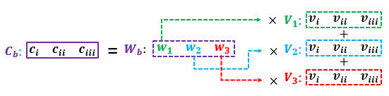 读过我写的线性代数教程的读者请回忆,矩阵乘矩阵的意义可以理解为批量的线性组合按顺序排列。 其中一个矩阵所表示的信息是多组权重,另一个矩阵所表示的信息是需要进行组合的向量。 大家习惯性的把组成成分放在矩阵乘法的右边,而把权重放在矩阵乘法的左边。 所以这个大型矩阵乘法可以用表示,其中