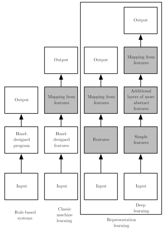 下图简述了机器学习的发展,从最初的人工定义特征再放入分类器的方法,到让机器自己学习特征,再到如今尽量减少人为干涉的deep learning。