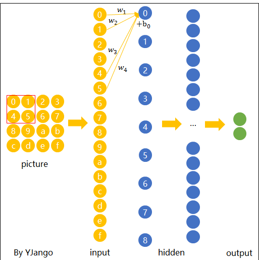 第二层的节点0的数值就是局部区域的线性组合,即被圈中节点的数值乘以对应的权重后相加。 用表示输入值,