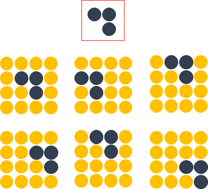 方便起见,我们用depth只有1的灰度图来举例。 想要完成的任务是:在宽长为4x4的图片中识别是否有下图所示的“横折”。 图中,黄色圆点表示值为0的像素,深色圆点表示值为1的像素。 我们知道不管这个横折在图片中的什么位置,都会被认为是相同的横折。
