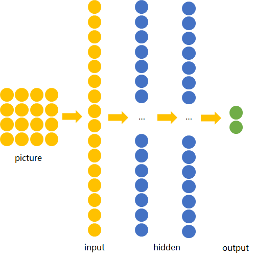 若训练前馈神经网络来完成该任务,那么表达图像的三维张量将会被摊平成一个向量,作为网络的输入,即(width, height, depth)为(4, 4, 1)的图片会被展成维度为16的向量作为网络的输入层。再经过几层不同节点个数的隐藏层,最终输出两个节点,分别表示“有横折的概率”和“没有横折的概率”,如下图所示。