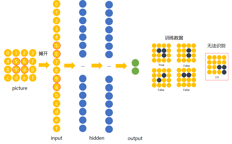 下面我们用数字(16进制)对图片中的每一个像素点(pixel)进行编号。 当使用右侧那种物体位于中间的训练数据来训练网络时,网络就只会对编号为5,6,9,a的节点的权重进行调节。 若让该网络识别位于右下角的“横折”时,则无法识别。