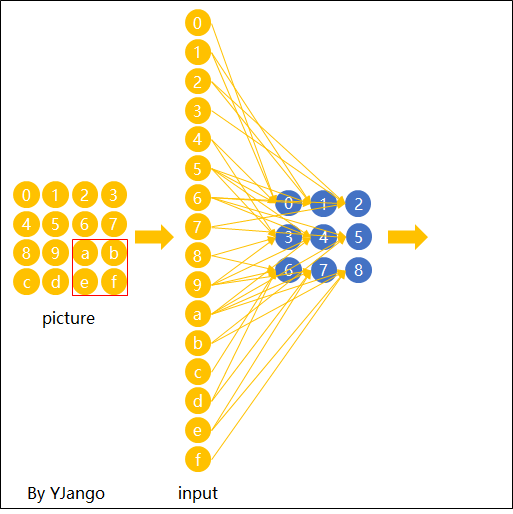 这也就是你们在网上所看到的下面这张图。在看这张图的时候请结合上图的连接一起理解,即输入(绿色)的每九个节点连接到输出(粉红色)的一个节点上的。
