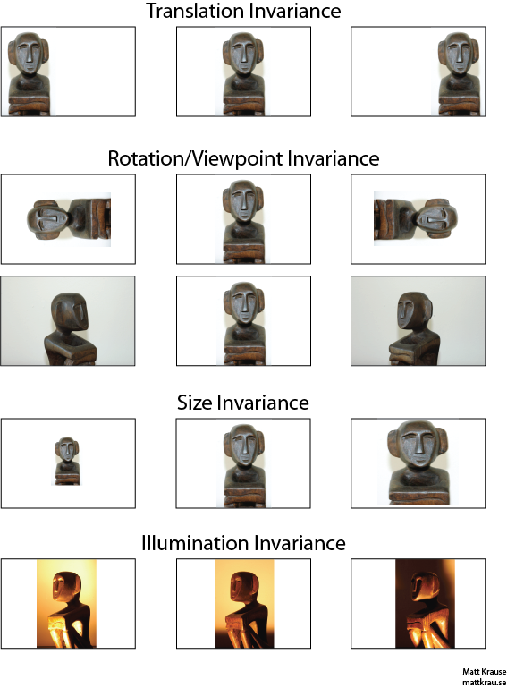 接下来会谈谈我个人的,对于画面不变性是如何被卷积神经网络满足的想法。 同时结合不变性,对上面提到的结构发展的重要变动进行直觉上的解读。