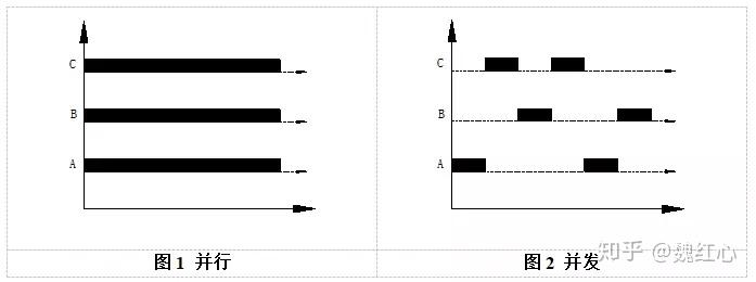 并发(concurrency):同一时刻只有一条指令在执行,但多个进程指令被快速轮换地执行,使得宏观上具有多个进程同时执行的效果,但在微观上并不是同时执行的。它只是把这段时间进行划分、快速交替地执行,如图2所示。