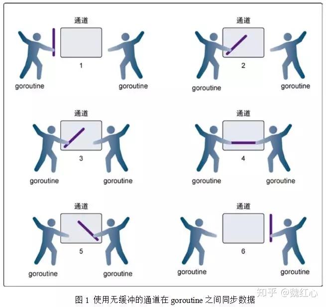 e. 第6步,两个goroutine都将它们的手从通道里拿出来,这模拟了被锁住的goroutine得到释放。两个goroutine现在都可以去做别的事情了。