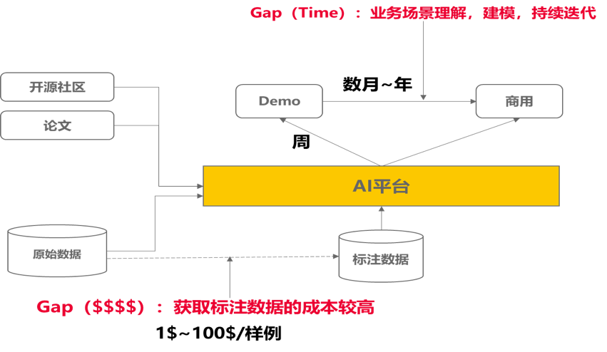 对于AI建模,本质上面是基于数据去生成模型的过程,那么一般来说,初始demo快的几天就可以出来,但是到真正落地的时候,少则花费算月,多则上年。这个过程中涉及两类的大量投入,一类投入获取训练数据,从数据收集和标注端到端,另一类投入不断模型迭代优化上,涉及到大量的领域技能。