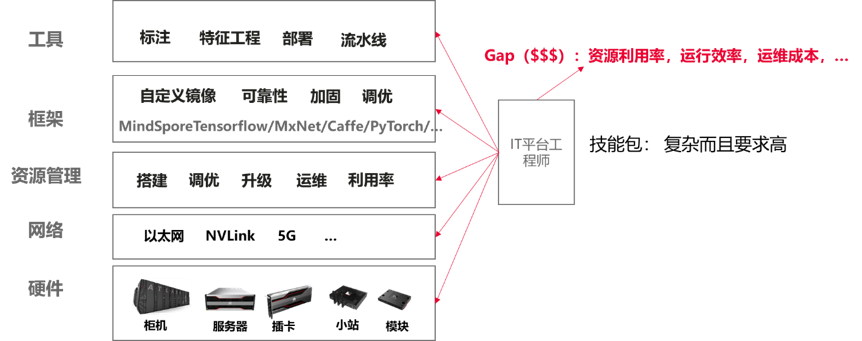 对于AI开发而言,如何利用好算力资源,提升资源利用率是目前特别重要的工作。往往算法工程师并不擅长这些事情,需要有专业的系统级工程师来帮助是实现,从集群的搭建、运维、固件运维、底层算子优化、分布式调优,以及大量的框架维护等方面,另外面向不同部门之间的资源管理也是IT工程师需要关注的内容。对于简单开发而言,自己用开源搭建搞搞是可行的,但是一旦需要大规模的商业化,需要一个有个比较好的平台尤为重要。