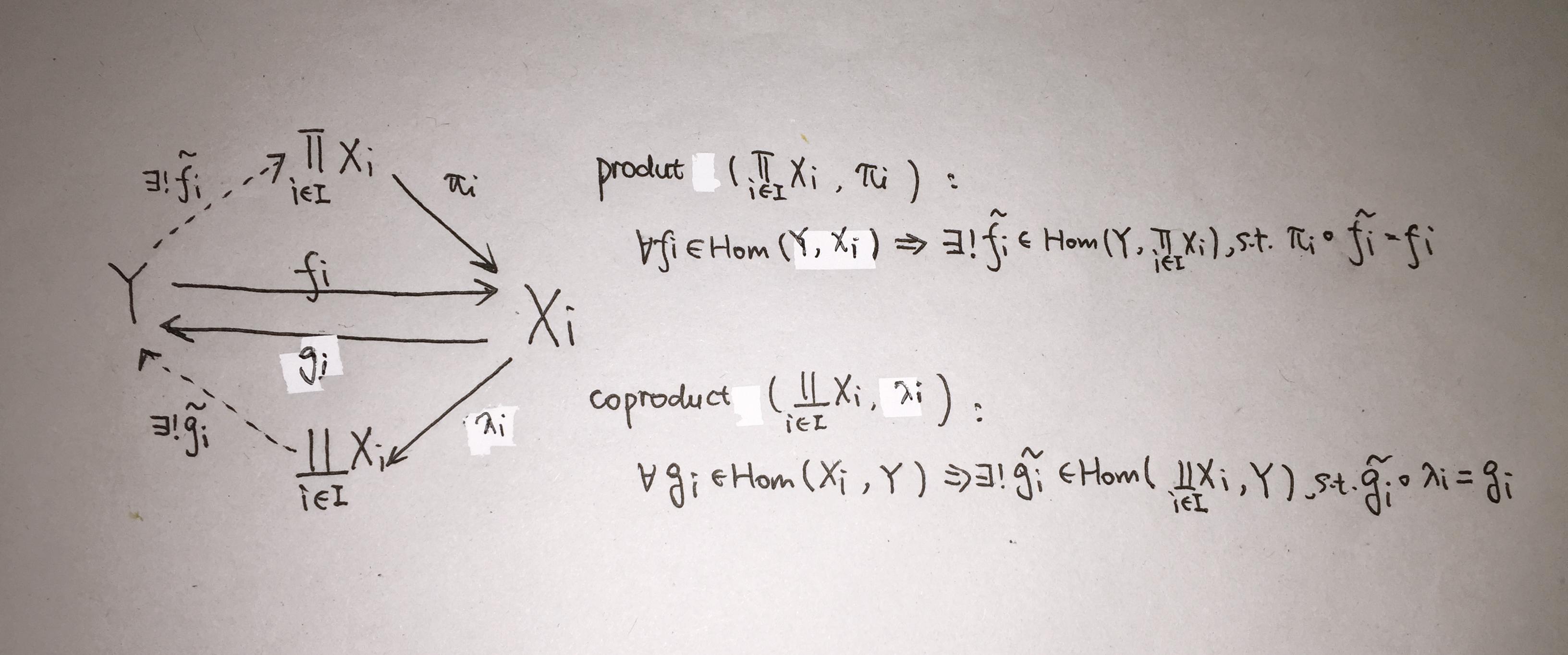 (注意:在一个范畴中,积与余积不一定存在!但若存在,则积(余积)在同构意义下唯一,此时称该范畴为积范畴(余积范畴))