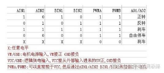 这里使用的电机驱动芯片为TB6612,该芯片可以十分方便的驱动两个直流电机的运行,其驱动逻辑表如下: