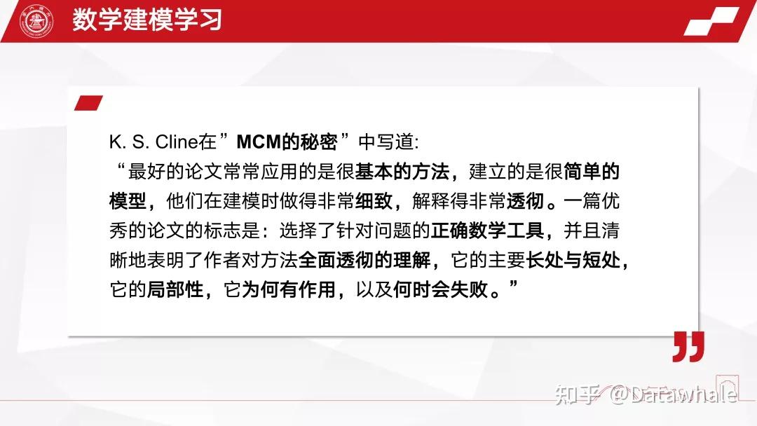 数学建模的关键不在于复杂,大道至简,如“MCM的秘密”中所说:“最好的论文常常应用的是很基本的方法,建立的是很简单的模型,他们在建模时做的非常细致,解释的非常透彻”。