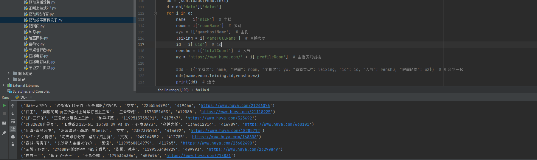 代码运行成功并实现抓取虎牙任意页面的基本数据