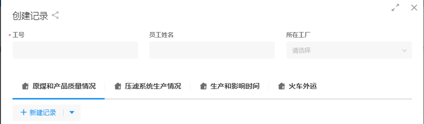 客户提供的工作日报内,各板块内要求填写的信息较多。为了避免用户查看日报内容时信息太冗长,我们可以依据表格内容的五大模块,分别建立工作表,再关联到日报工作表中。这样,我们要再用到一个控件,即关联记录。效果如图: