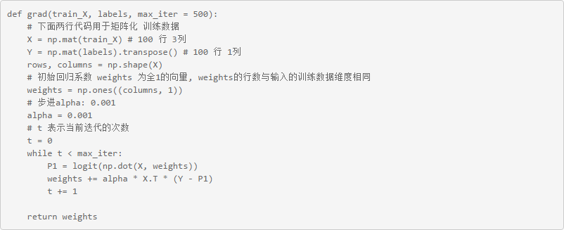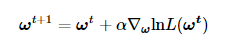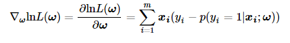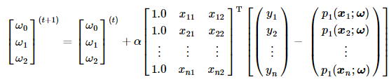 上述算法的倒数第三行,我们用矩阵形式表示梯度上升法的迭代公式,其具体数学形式如下: