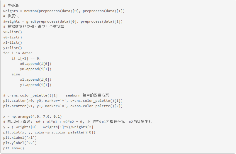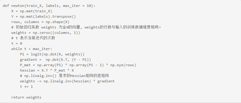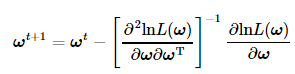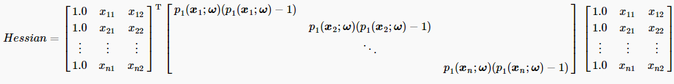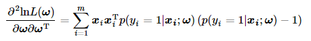 选择牛顿法求解Logistic Regression中的最优回归系数。根据牛顿法迭代上述式子和Hessian矩阵的定义,把Logistic Regression中的回归系数迭代更新公式为: