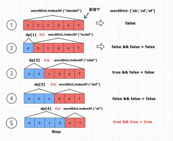 下面是根据根据已有的dp[1] 到dp[5]的布尔值,动态计算dp[6] 的过程